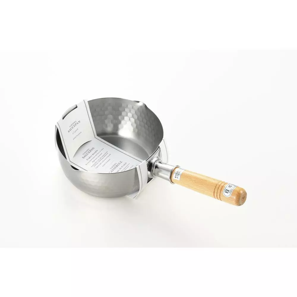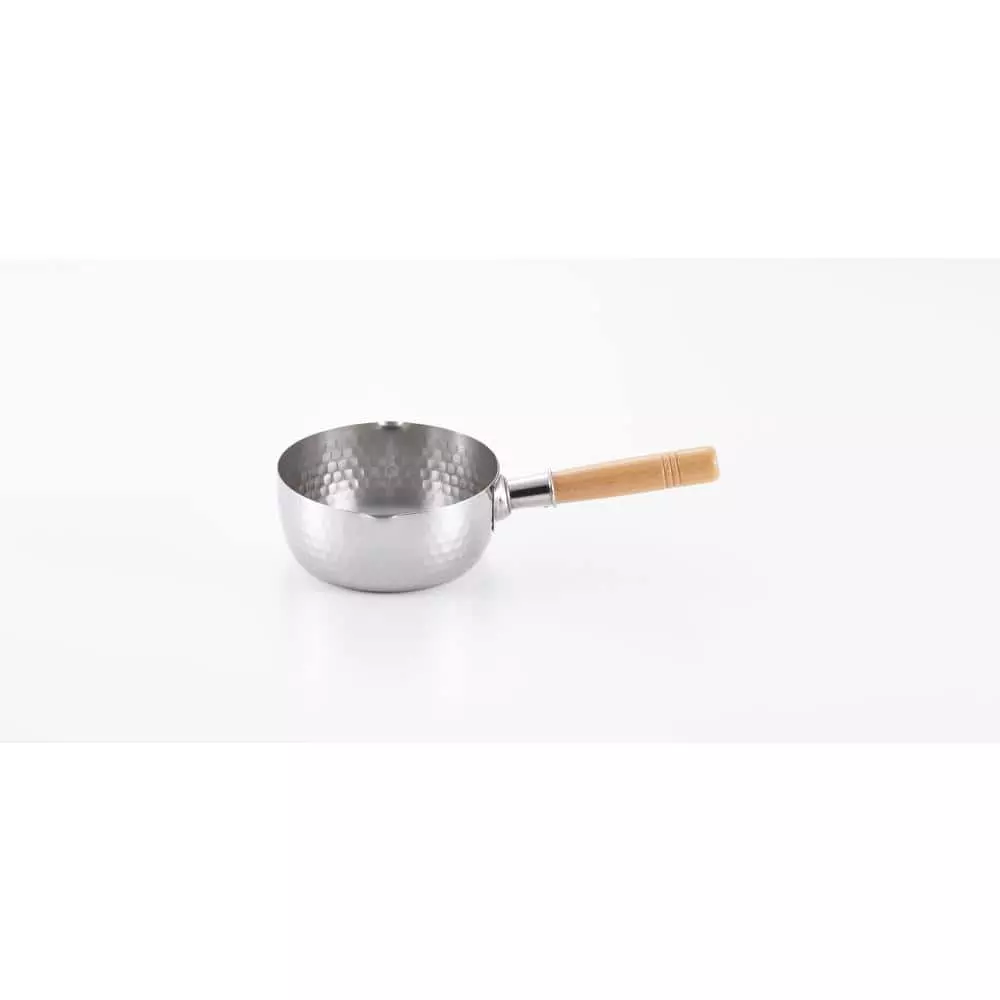 1.2 qt. Traditional Japanese Yukihira Pot perfect for making noodles, soups, and broths. Light weight, thin walled hammered stainless steel with comfortable beechwood handle. Pouring Spouts on both sides. Lid sold separately.
