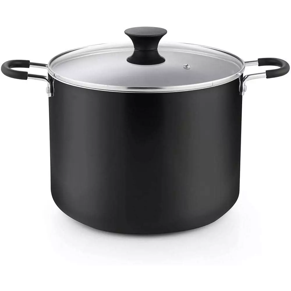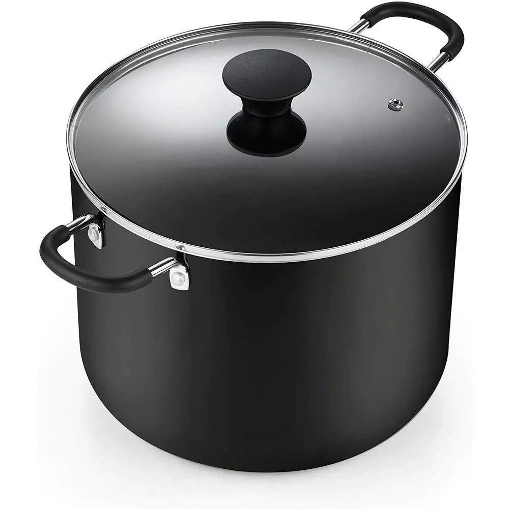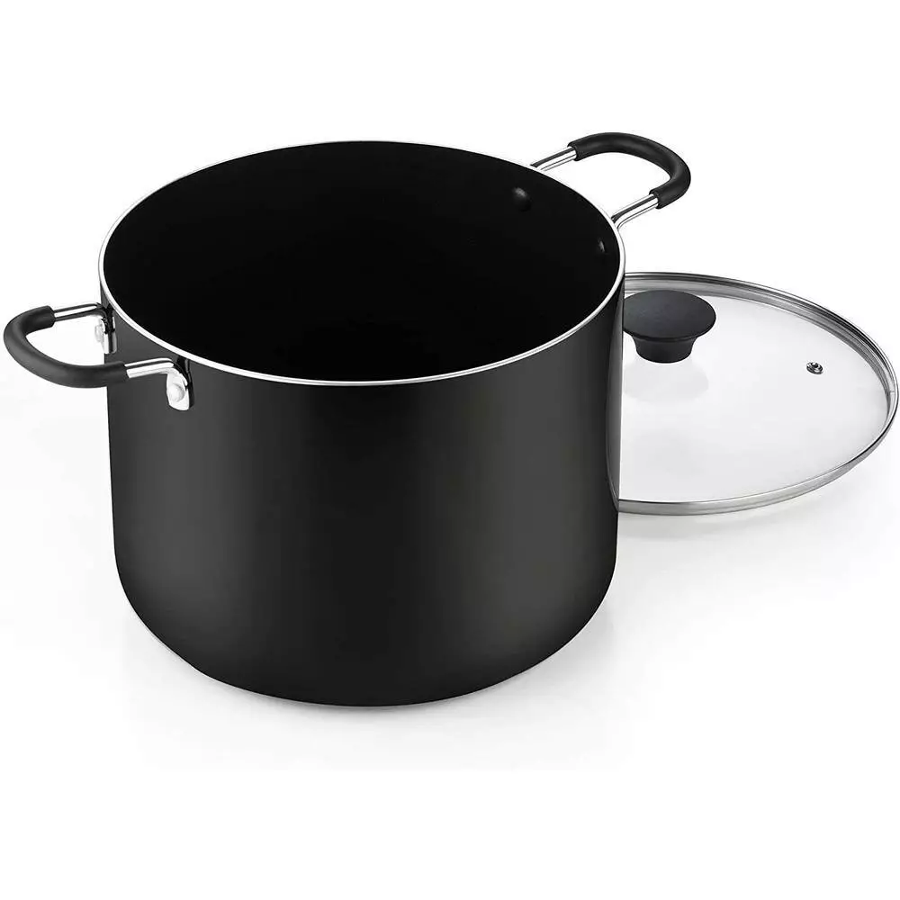 The Cook N Home 10. 5 qt. nonstick stockpot with lid, Black is made of thick gauge aluminum that provides even heat conduction and prevents hot spots. Nonstick coating Black interior makes food release and cleaning easy. Pfoa, cadmium, and lead-free. Stay-cool handles are comfortable and are riveted for strength and durability. Tempered glass lid with steam vent makes viewing food easy from start to finish. Induction compatible. Works on gas, electric, glass, halogen, etc. Oven safe to 350F. Dishwasher safe.