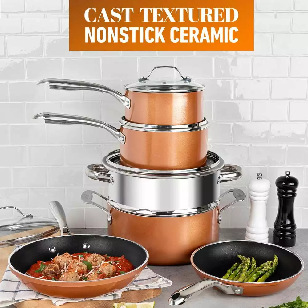 - COMPLETE COOKWARE SET – this set includes everything you need to outfit your kitchen and get cooking right out of the box, including a 8.5″ skillet, 10.25″ frying pan, tempered glass lid for 10.25″ frying pan, 1.5 quart sauce pan with tempered glass lid, 2.5 quart stock pot with tempered glass lid, 5 quart stock pot with tempered glass lid, XL aluminum steamer insert