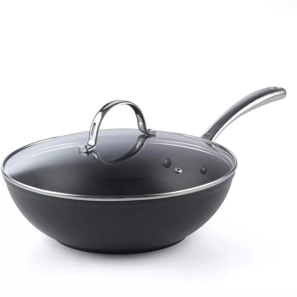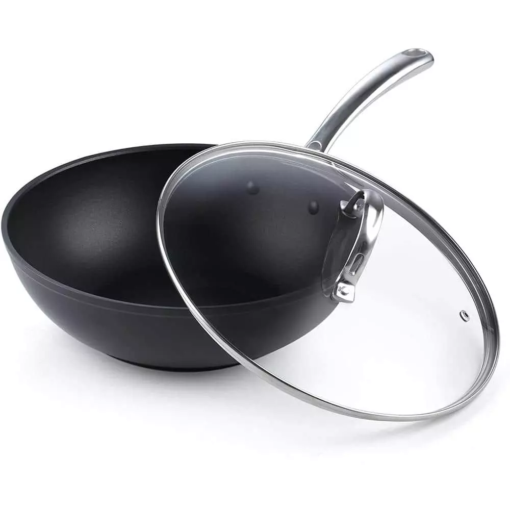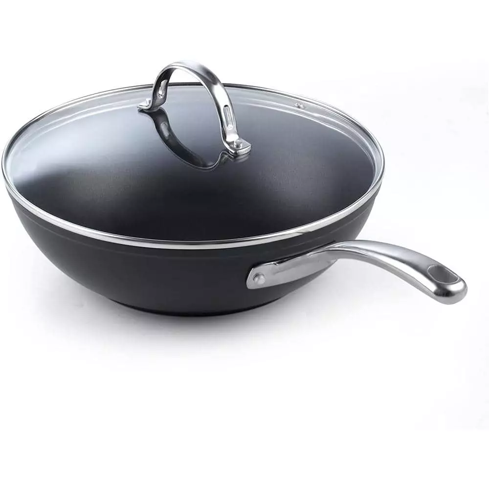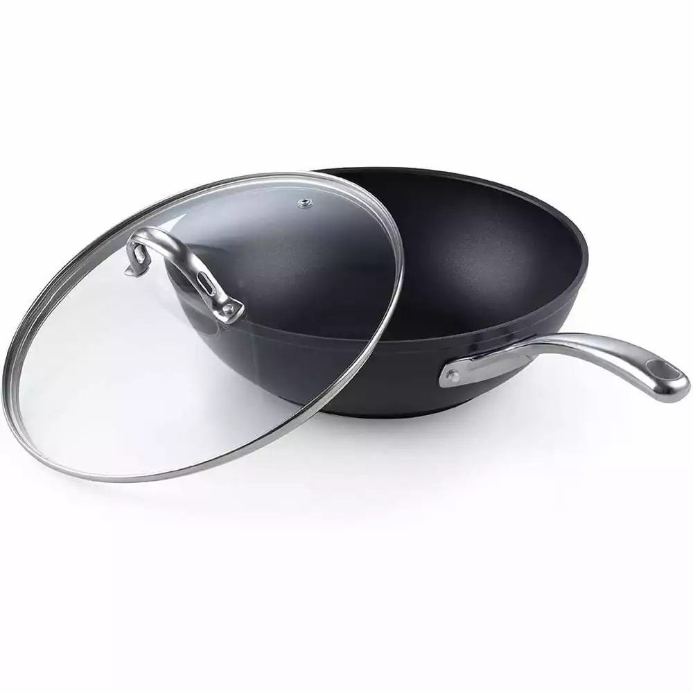 The Cooks Standard 11 in. Hard Anodized Nonstick Wok Stir Fry Pan Flat Bottom With Lid, Black, 28cm has a hard anodized surface that is durable, heats evenly/quickly, and prevents hot spots. Material is harder than steel, thick, and chip-resistant. Nonstick performance for easy food release/tossing, cleaning, and allows for healthy cooking. Tempered glass lid with steam vent is protected by a stainless steel rim to view food. Long riveted stainless steel handle stays cool/comfortable and is strong. Wide and deep to hold a large amount of food for multipurpose use: stir frying, sauteing, frying, and more. Not induction compatible. Works on gas, electric, glass, ceramic, halogen, etc. Oven safe to 450F, glass lid to 350F. Dishwasher safe, hand wash recommended.