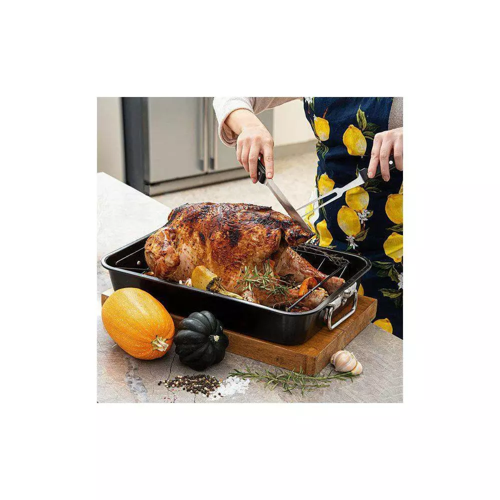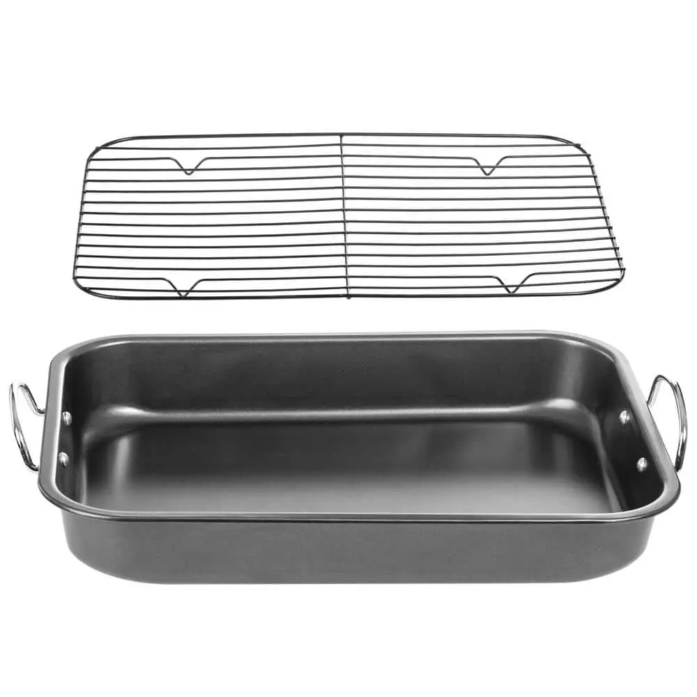 Roast your meat with this high quality end stainless steel baking pan, made from Carbon Steel and made durable for heavy-duty. It cooks evenly and beautifully with anything you roast. Perfect for baking brownies, lasagna and much more. It comes with a removable rack. It has heavy-duty riveted handles that can be folded down for easy storage. Easy to clean afterwards.