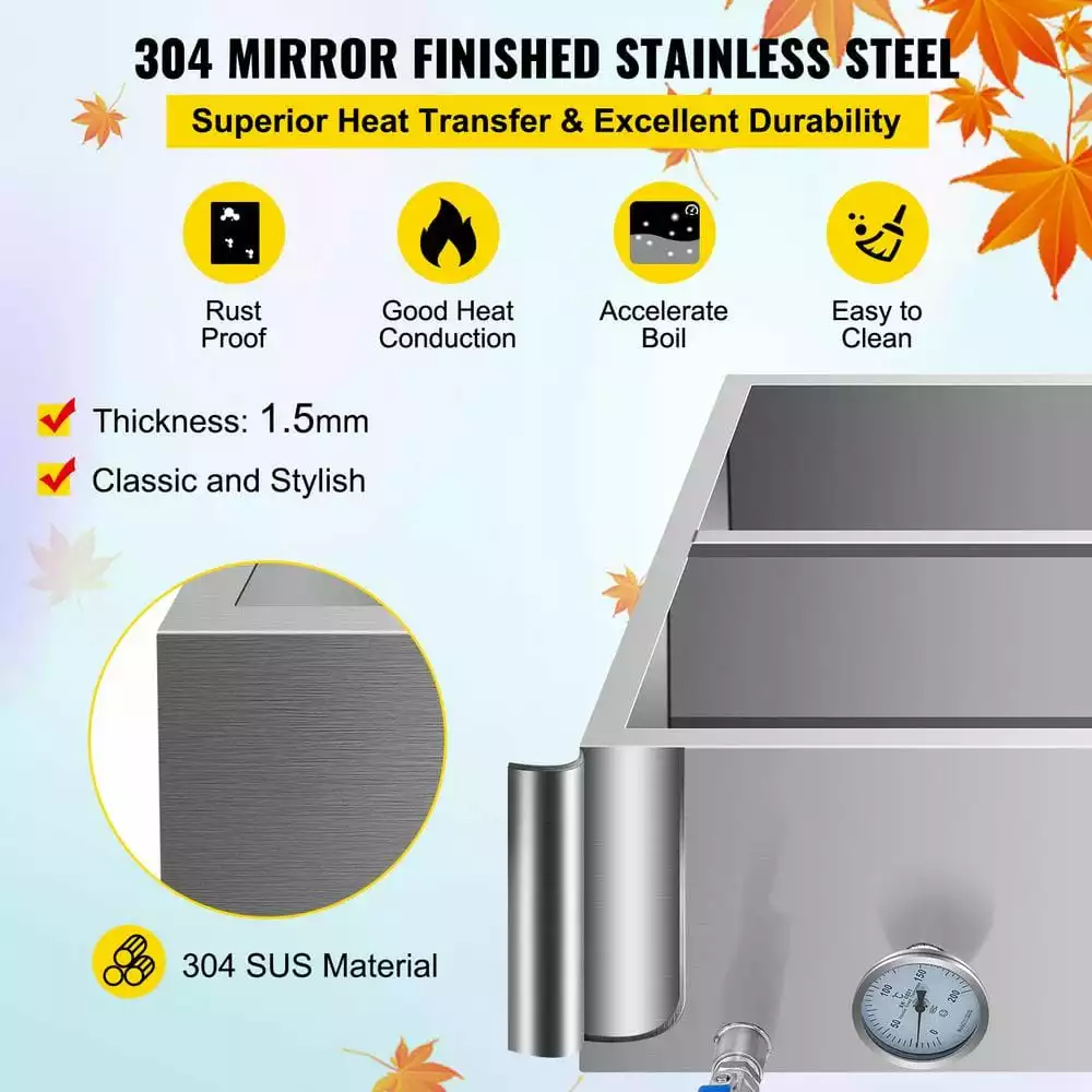 This VEVOR superior evaporator pan is 304 food-grade stainless steel with a mirror-finished surface. It comes with a 3/4 in. throttle valve, which facilitate you to control the maple syrup. Great for pancakes, waffles, oatmeal, ice cream, and more. Start taking action today and get your “health angel” tomorrow!