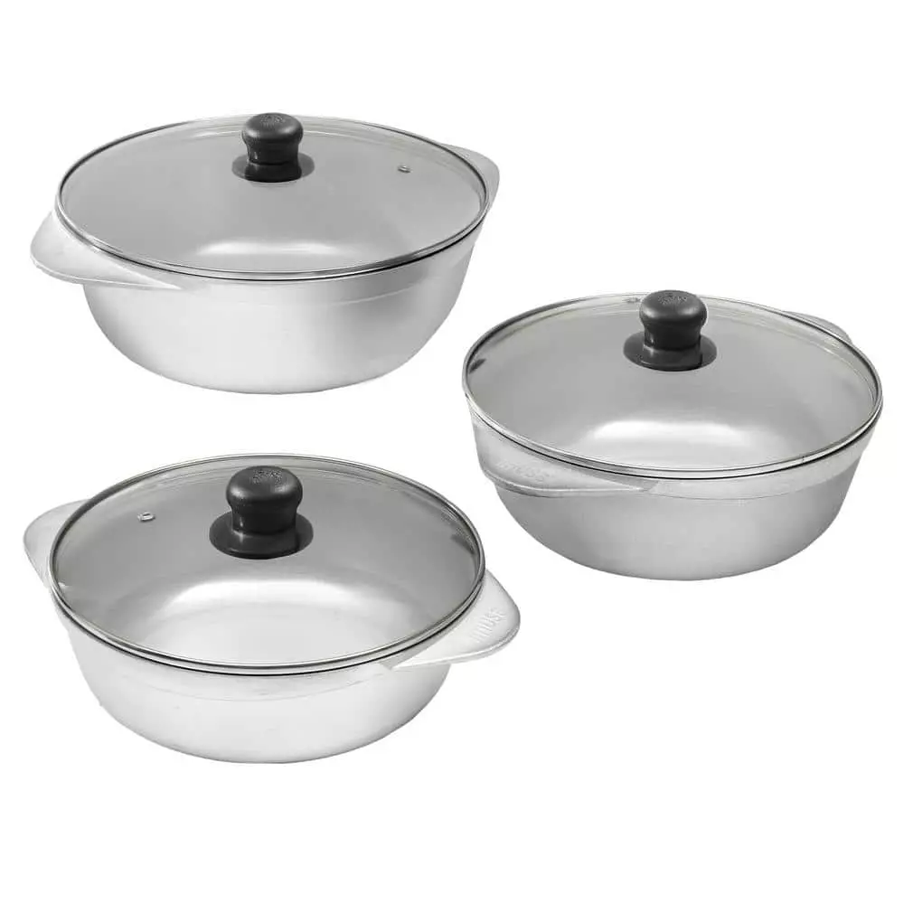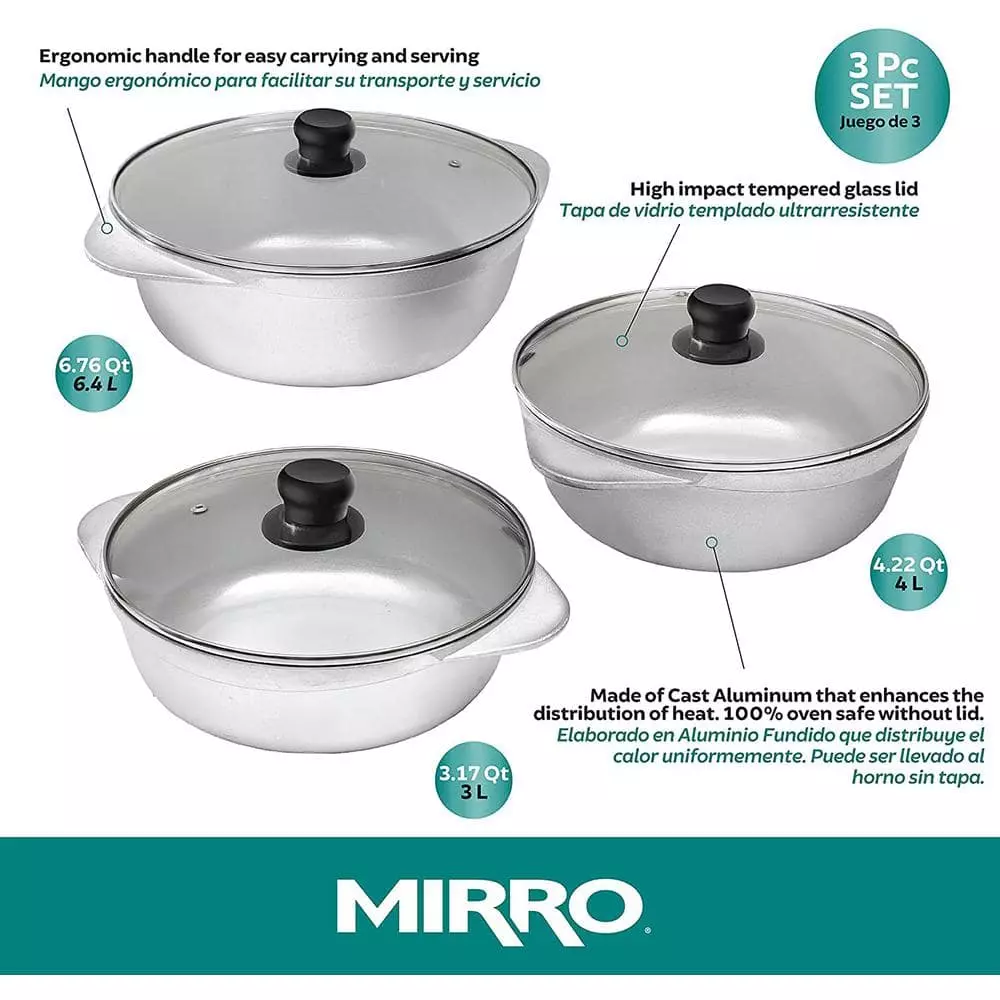 The IMUSA MIR-11260 3 piece Cocotte Set features ergonomic handle for easy carrying and serving. The high impact tempered glass lid fits tightly to seal in the flavor and the cast Aluminum enhances the distribution of heat. They are oven safe without the lid as well! Sizes include 3.17 qt, 4.22 qt and 6.76 qt.
