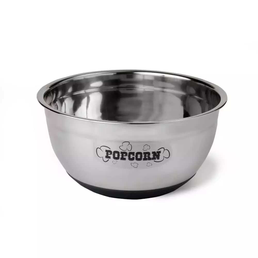 - Stainless steel popcorn bowl makes a functional addition to the kitchen, thanks to a non-skid black base, large rim and 8 Qt. capacity for serving