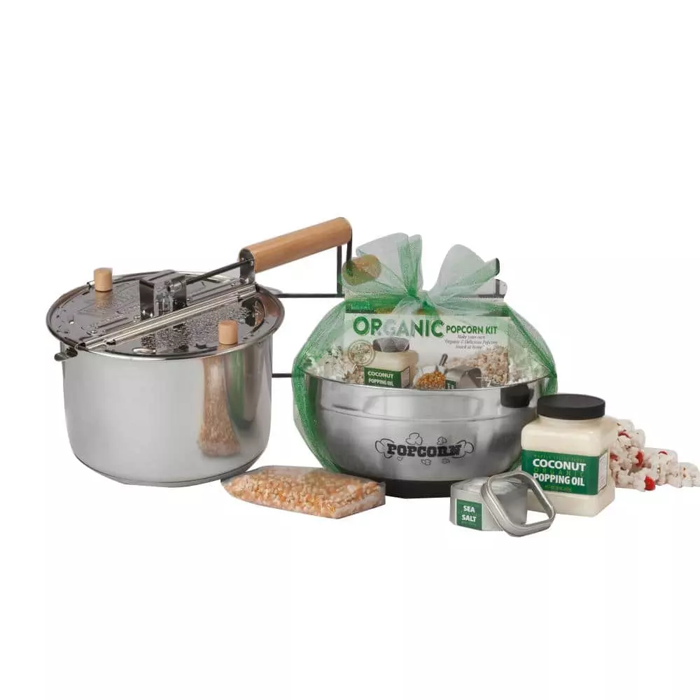 The Stainless Steel Whirley-Pop and DIY Organic Popcorn Kit combine for a healthy popcorn snack. Featuring the 6 Qt. Stainless Steel Whirley-Pop with organic popping ingredients and a matching stainless steel serving bowl, this is set is all-inclusive and easy to use. With heavy-duty metal gears you can pop batch after batch. This popper is compatible on electric, gas and induction cook tops. The DIY Organic Popcorn Kit includes gourmet ingredients for a nutritious and delicious snack: Organic Coconut Oil (16 oz.), Organic Yellow Kernels (8 oz.) and Extra Fine Sea Salt (3 oz.). Pour your freshly popped organic snack into a sleek stainless steel bowl. Features a non-slip black base, large rim and coordinating “Popcorn” graphics with an 8 Qt. capacity. Purchase includes popper plus DIY Organic Popcorn Kit and Stainless Steel Bowl.