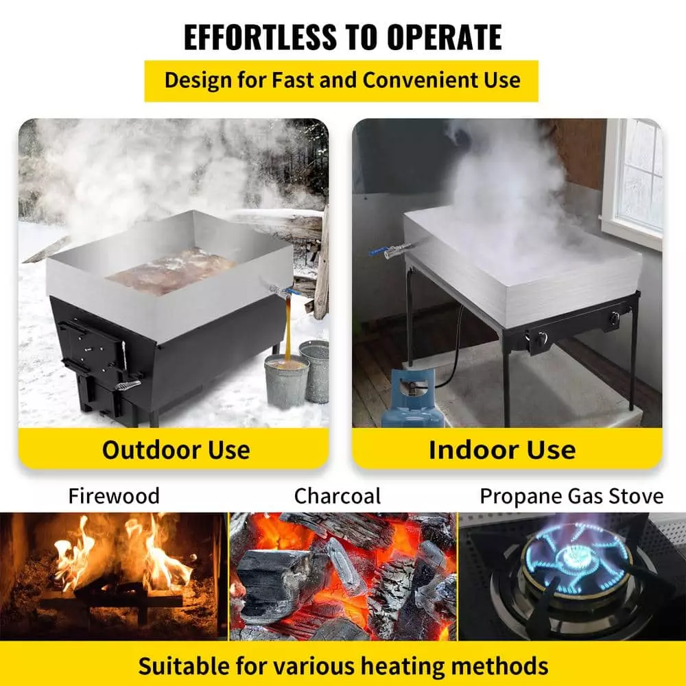 - Outdoor & Indoor Use: This syrup pan is suitable for outdoor or indoor use, and supports many heating fuels: firewood, charcoal, propane gas stove, etc. It can be used according to your cooking preferences, very convenient, and there is no need to buy additional accessories