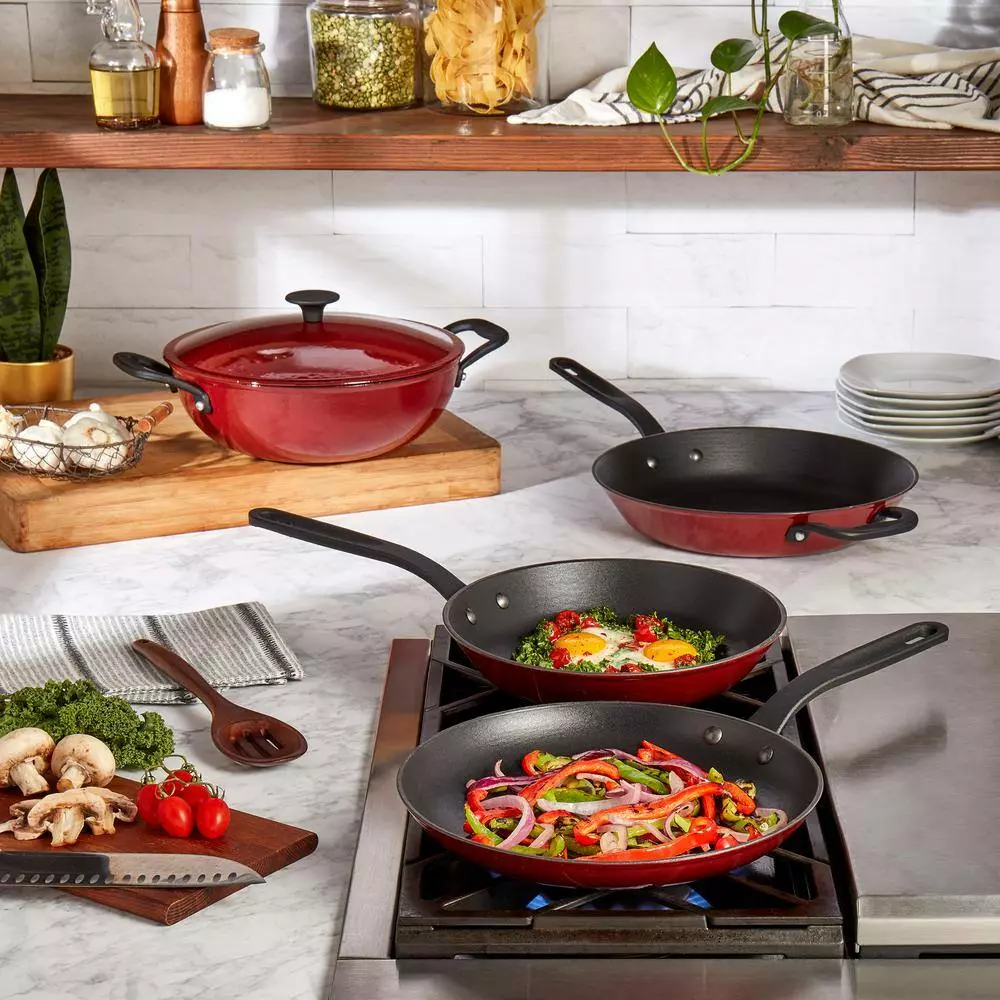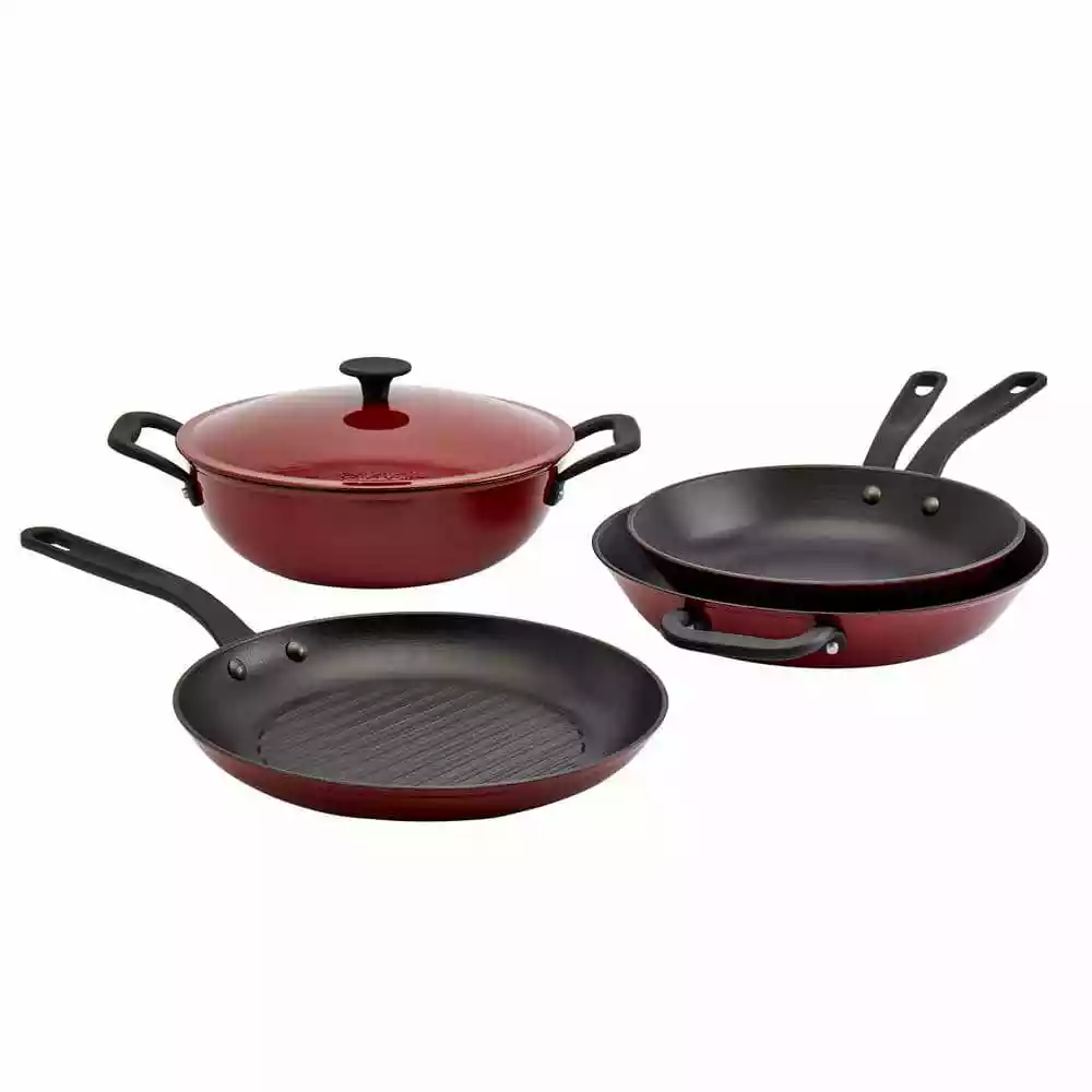 The enameled cast iron cookware set from Mason Craft & More is a beautiful piece of cookware designed for long-lasting performance and durability. The enameled cast iron construction enhance the cooking process by evenly distributing heat and locking in moisture to deliver tender, flavorful food. Perfect for everything from slow-cooking to baking, these cookware set is essential for any kitchen collection.CONTAINS :* 4.5Qt Braiser* 11″ Grill Pan* 10″ Fry Pan* 12″ Fry Pan