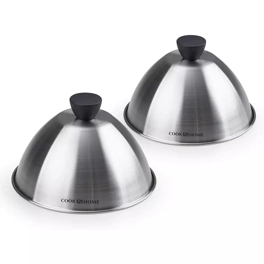 The Cook N Home Stainless Steel Grill Cooking Steaming Dome lid 6-in., 2Pack is made of 18/10 stainless steel with a plastic handle. Fits 6 in. pans, pots, and surfaces for steaming and keeping in moisture. Indoor and outdoor use for retaining heat, reducing splatters, and covering. Reinforced lip creates a tight seal to infuse flavor into food, shortens cooking time. Cook burgers/patties faster, retains the juices, and allows for melting cheese on top. Can be used on grills/griddles, barbecues, Japanese Teppanyaki, etc. dishwasher safe.