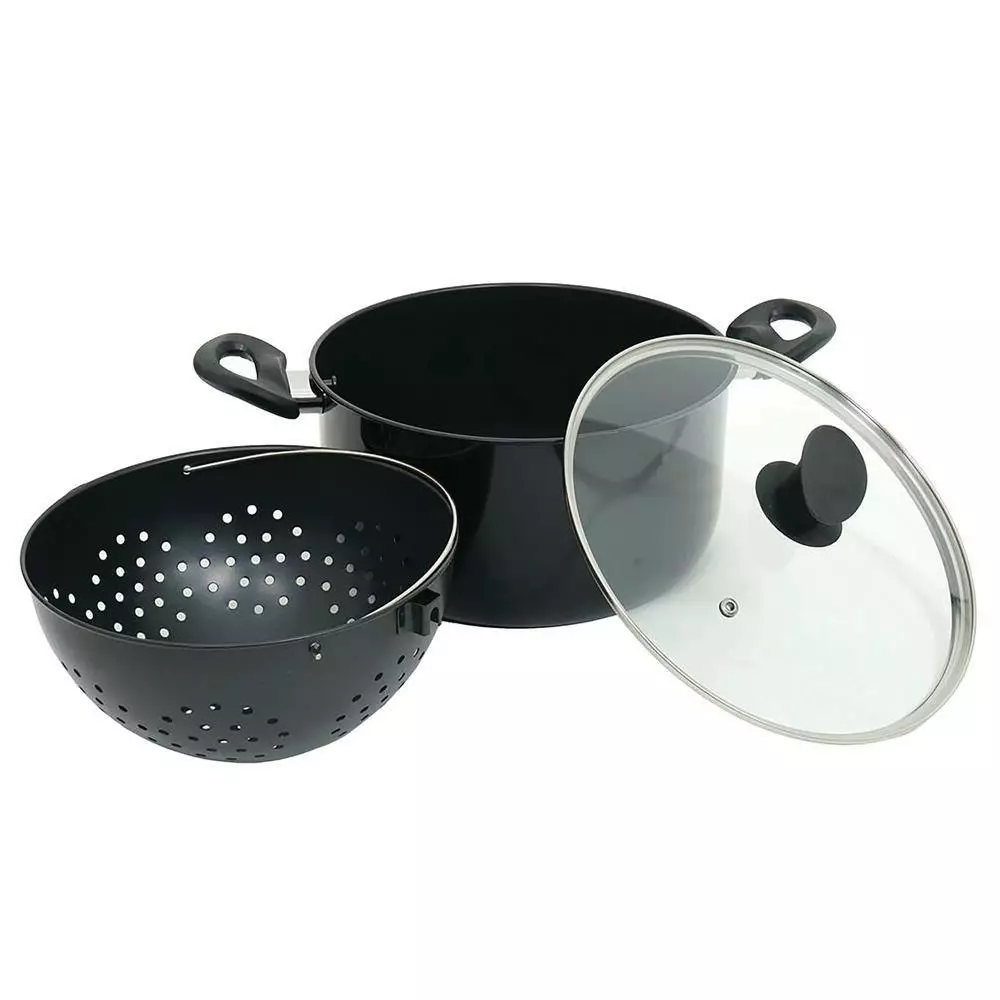 - 3-piece set features 6 qt. cooking pot, draining basket, and see-through lid