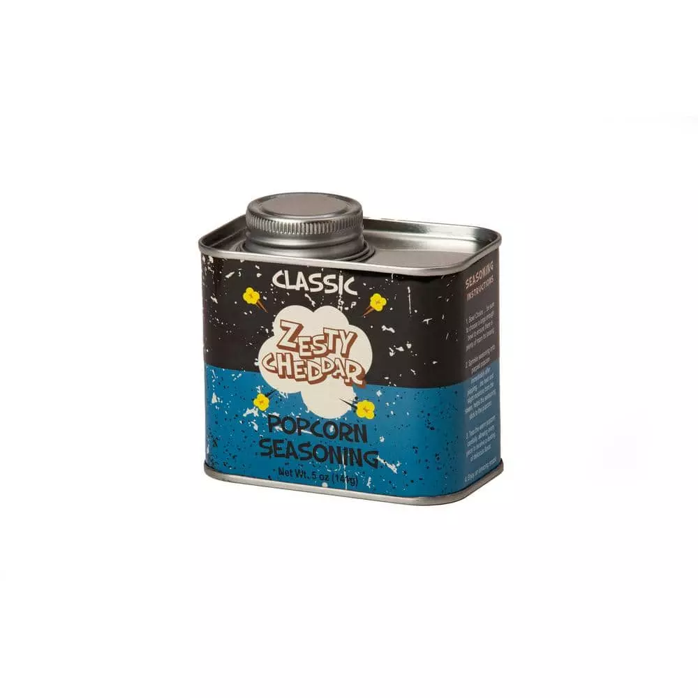 - Zesty Cheddar Cheese Seasoning in Retro Tin – will be your favorite popcorn seasoning in an undeniably fun classic box.