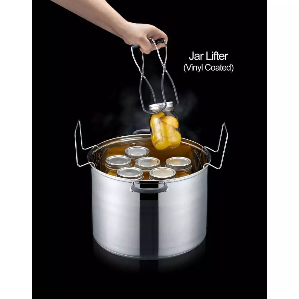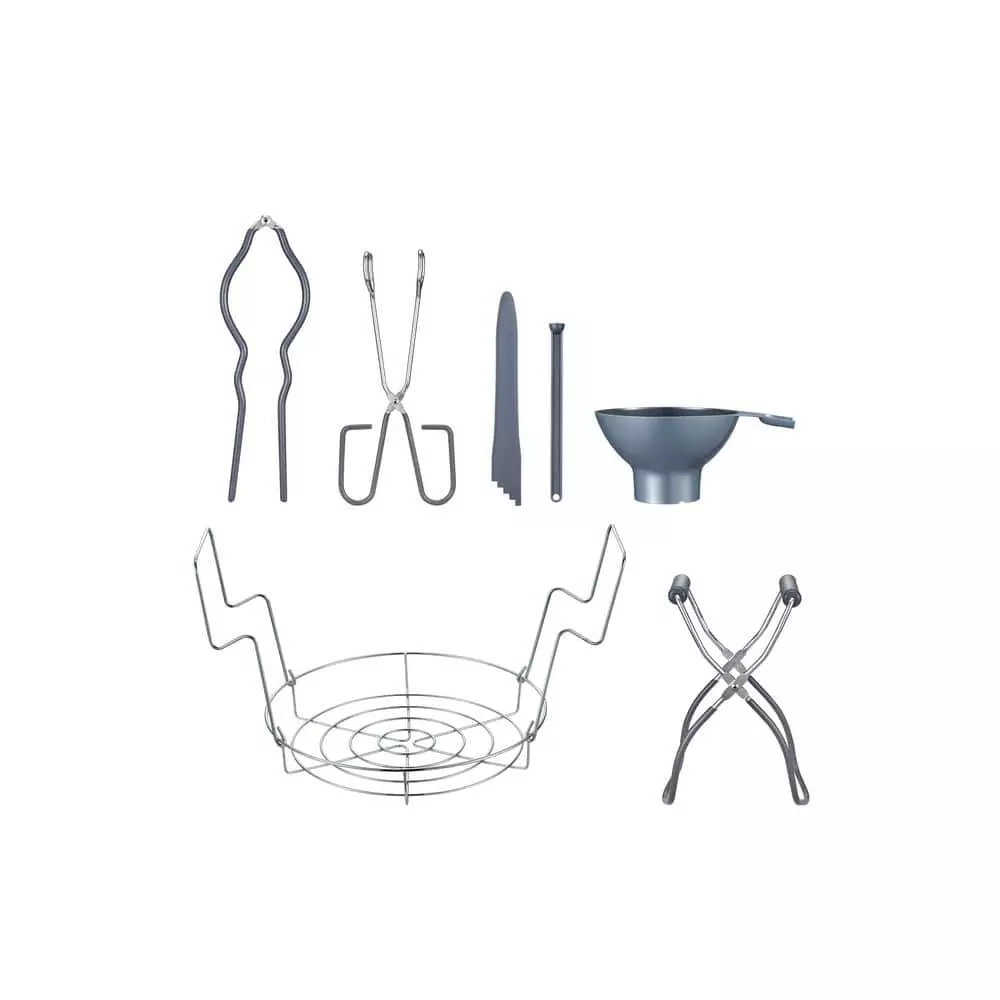 - Set includes: tongs (vinyl coated), Jar lifter (vinyl coated), jar wrench (vinyl coated), funnel, magnetic lid lifter, mixer/ measurer, and a stainless steel 12.25 in. rack