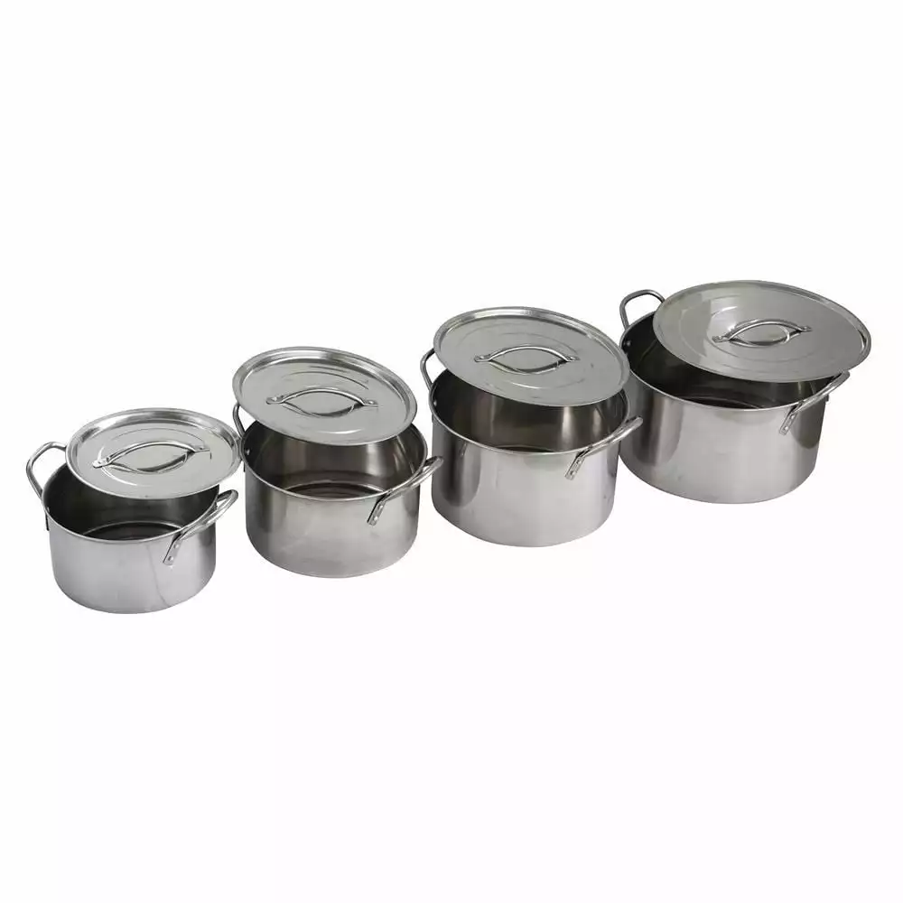 Simmer and boil delicious soups, stews, and broth with the AmeriHome 8 Piece Stainless Steel Stock Pot Set. Four pots with matching fitted lids are constructed of 202 grade stainless steel, which conducts heat well, plus it is tough and long lasting. Ideal for the campsite, or as an extra set of pans in the trailer or RV. The stainless steel construction also makes this set dishwasher safe, so clean-up is simple. Two riveted handles on each pot can safely take the weight of a full Stock Pot. Hollow handles on the lid stay cooler to the touch.