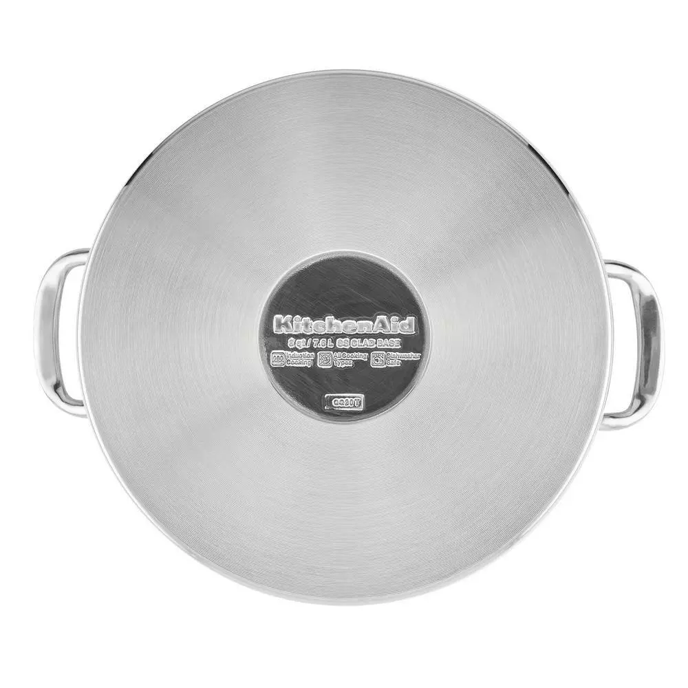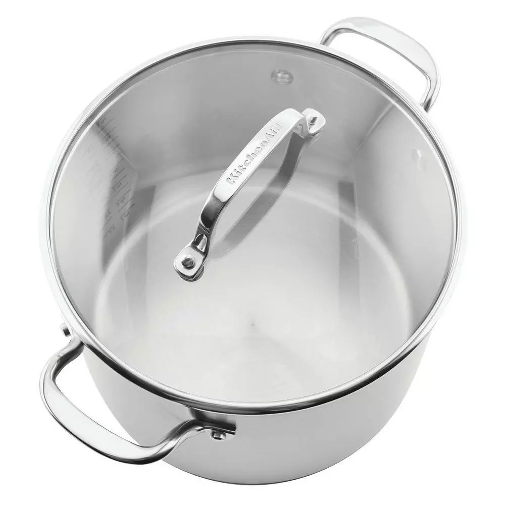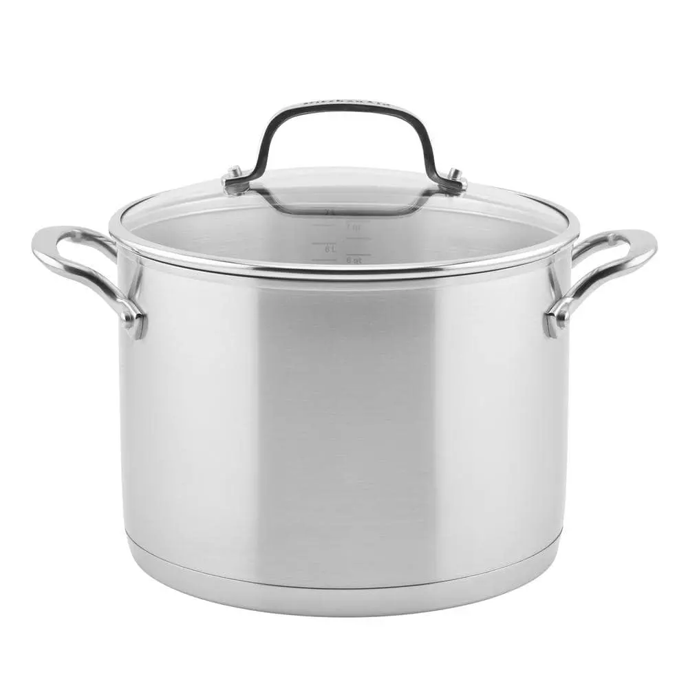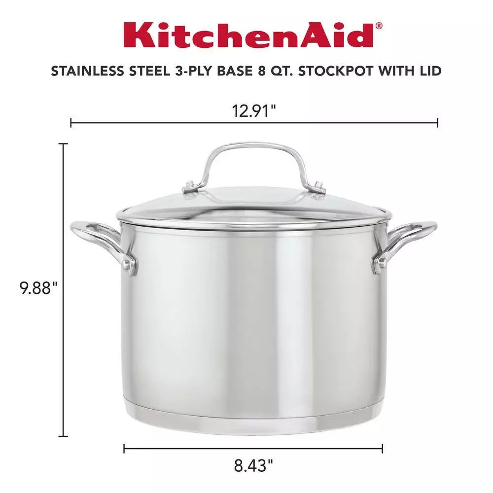 Experiment with and discover new flavors and techniques when cooking with the KitchenAid 3-Ply Base Stainless Steel Stockpot, designed with an extra thick layer of heat-conducting aluminum to eliminate hot spots by distributing heat evenly from edge to edge. Heavy-gauge stainless steel pot features a heavy bottom base for lasting durability, and has etched measuring marks to explore and test ingredients for new recipes. Tempered glass lid helps to lock in heat for rich and textured flavor. Curious cooks can investigate a wider range of recipes in the broiler and oven, where cookware is safe to 500°F, 350°F with lid.
