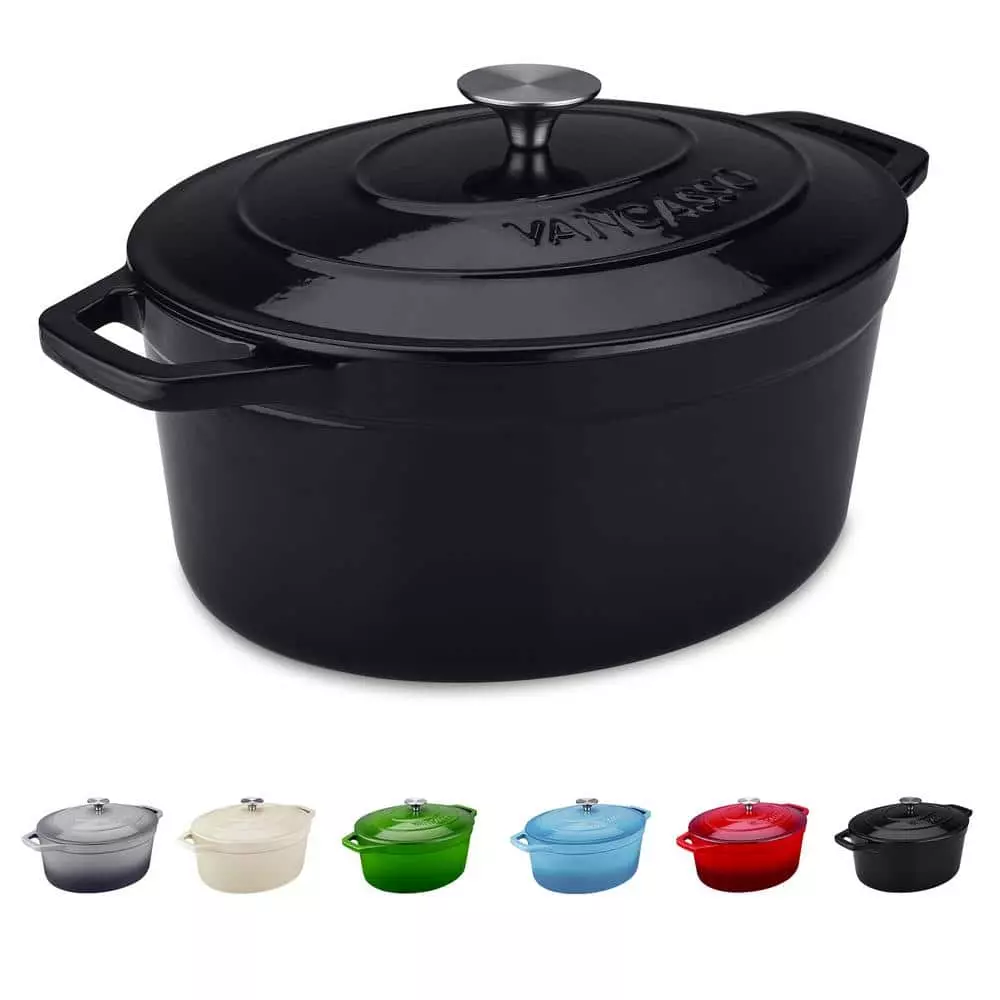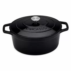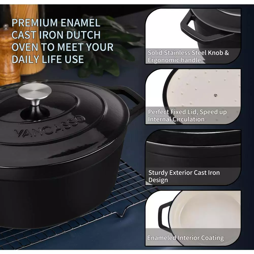 The enameled cast iron dutch oven with a self-basting Lid, ideal for delicious dinners for any occasion. The oversized handles and stainless-steel knob provide a sturdy grip for easy handling and carrying. Interior enamel has a smooth finish that promotes caramelization, prevents sticking, and resists stains. Ideal for roasting meat, slow cooking stews, baking bread and all kitchen tasks. You’ll enjoy a lifetime of healthy cooking with your vancasso cookware.