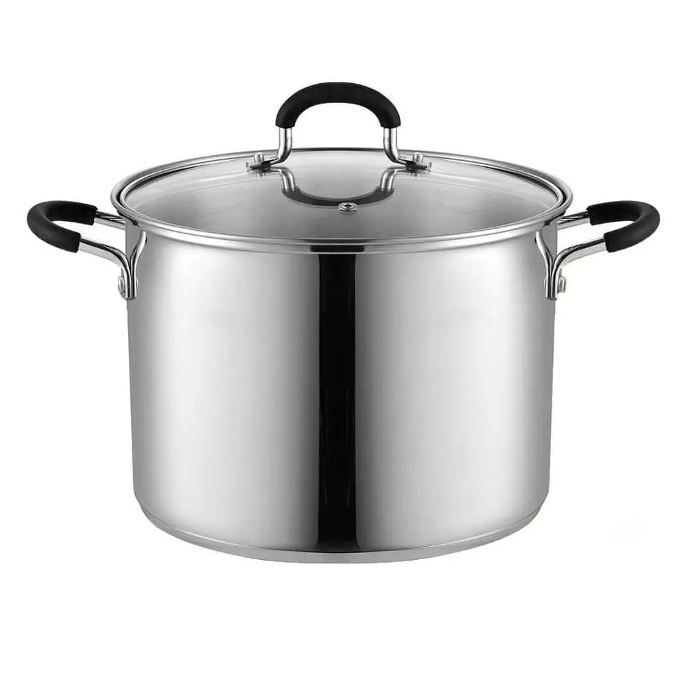 The Cook N Home 8 Qt. Stainless Steel Stockpot Saucepot with Lid is made of mirror polished 18 to 10 stainless steel for durability and easy cleaning. Aluminum disc layer in bottom for even heat distribution and prevents hot spots. Tempered glass lid with steam vent to view food while cooking. Riveted handles are comfortable and stay cool. Reinforced rim for long heating and pouring. Large size for multipurpose function and can be used for canning and jarring. Induction compatible. Works on gas, electric, glass, ceramic, halogen, etc. Oven safe to 350°F. Dishwasher safe.