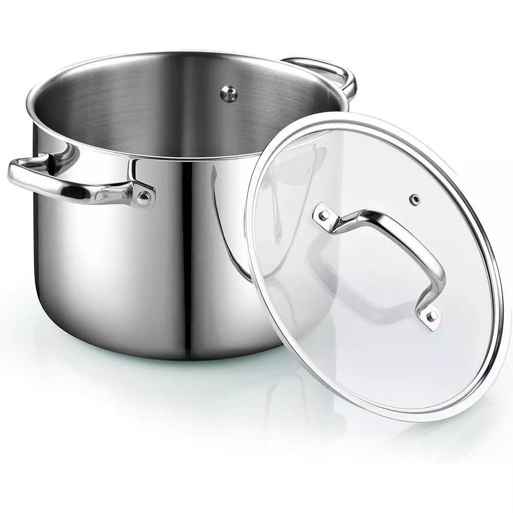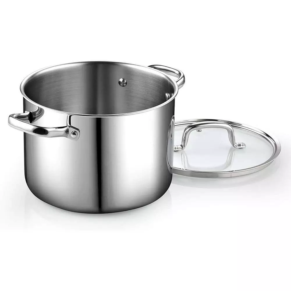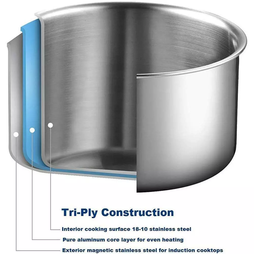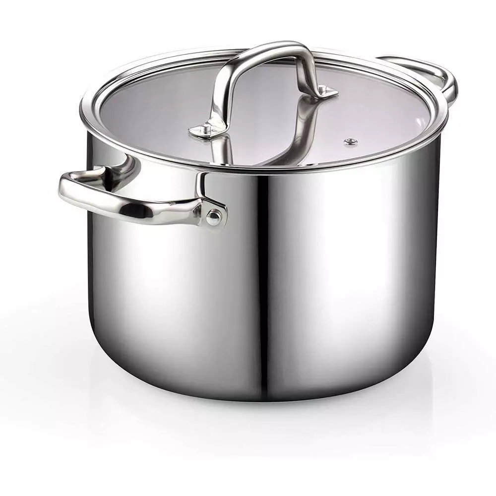 Tri-ply Clad metal construction is a combination of 18/10 stainless steel with an aluminium core creating a permanent bond of metal allowing heat to pass through the whole pan-along the bottom and up The sidewall-giving you a maximum cooking performance The Cook N Home Tri-Ply Clad Stainless Steel Stockpot with Lid 8 qt. comes with a tempered glass lid with steam vent to view food and keep heat/moisture in It has riveted handles for strength Induction compatible can be used on all type of stovetop gas electric ceramic glass Oven-safe up to 500° Fahrenheit glass lid 350° Fahrenheit Dishwasher safe hand washing is recommended.