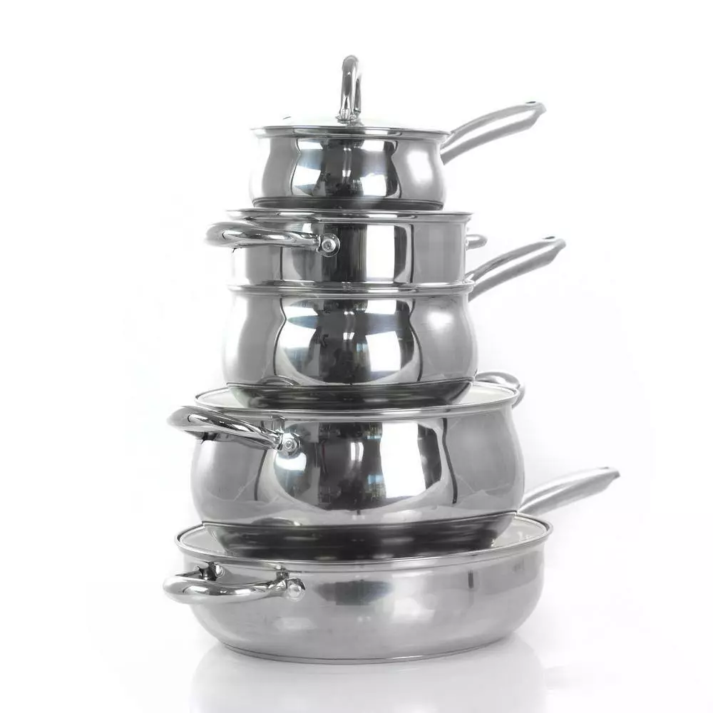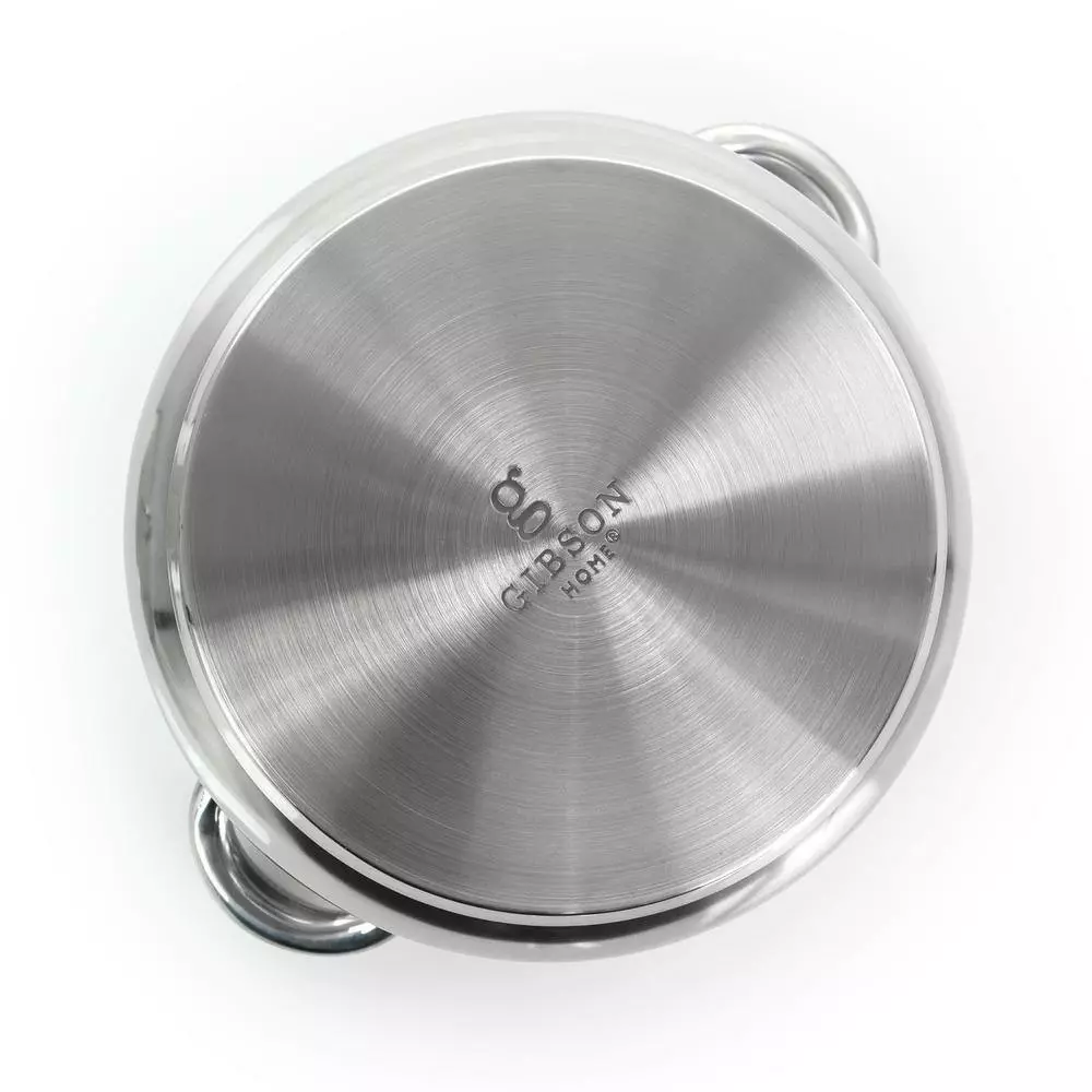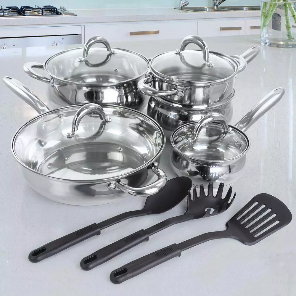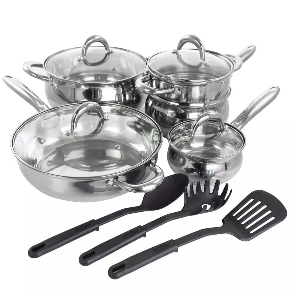 Concoct your wildest edible dreams with the Gibson Home Ancona 12-Piece Stainless Steel Belly Shaped Cookware Set with Kitchen Tools. Perfect for any home chef, this set features an assortment of pots and pans for a multitude of recipes. The belly shaped base provides larger capacity cooking for saucy or soupy dishes. Built with stainless steel, each piece is built to last while boasting an appealing mirror polish exterior. Cook a variety of dishes from beginner level snacks to expert cuisines.