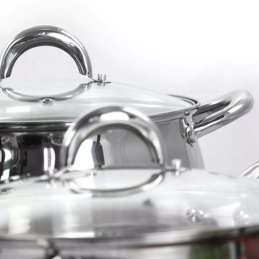 - Set includes: one 1.3 qt. saucepan with lid, one 3 qt. saucepan with lid, one 2.3 qt. steamer insert, one 6.5 qt. dutch oven with lid, one 5.6 qt. saute pan with lid, 3-nylon tools
