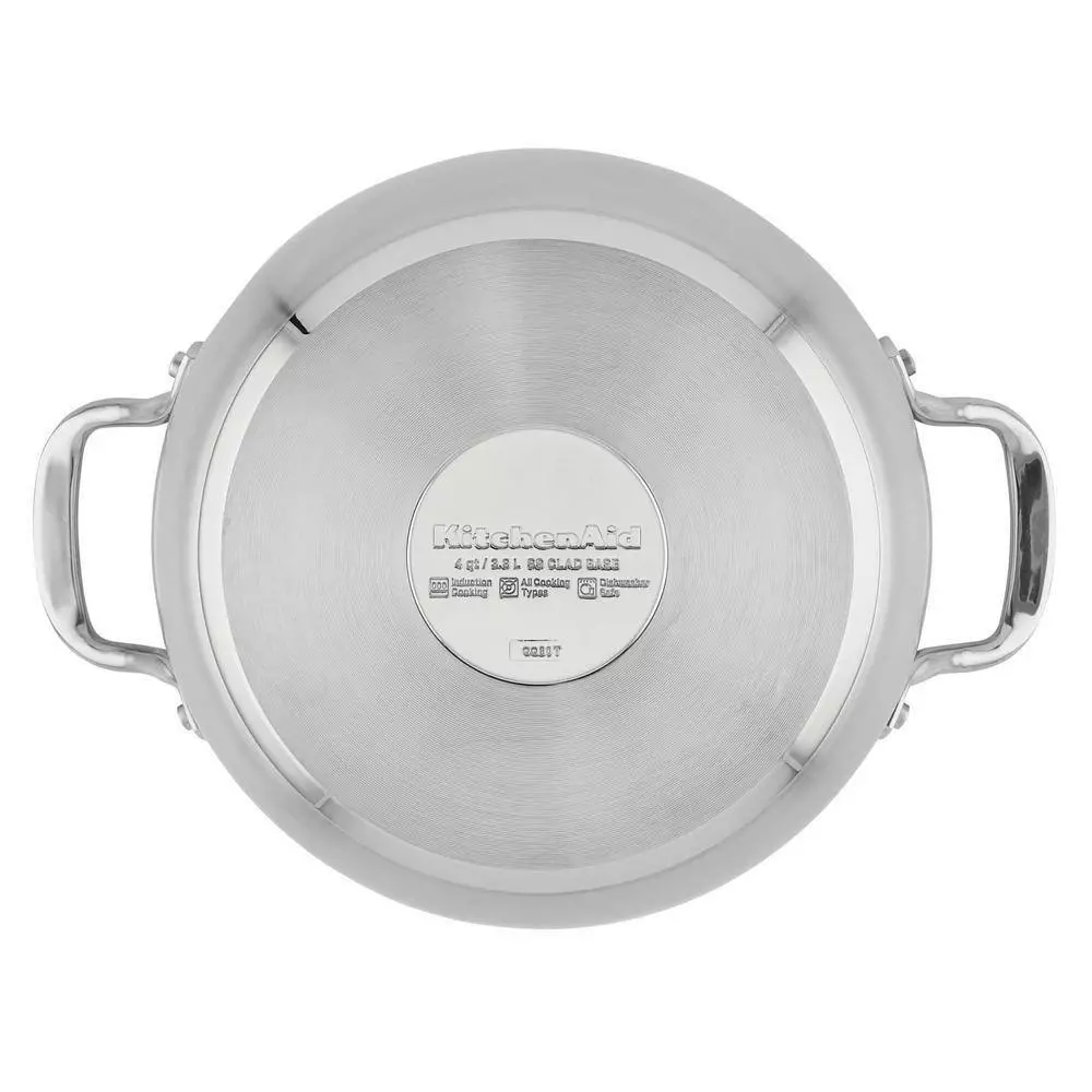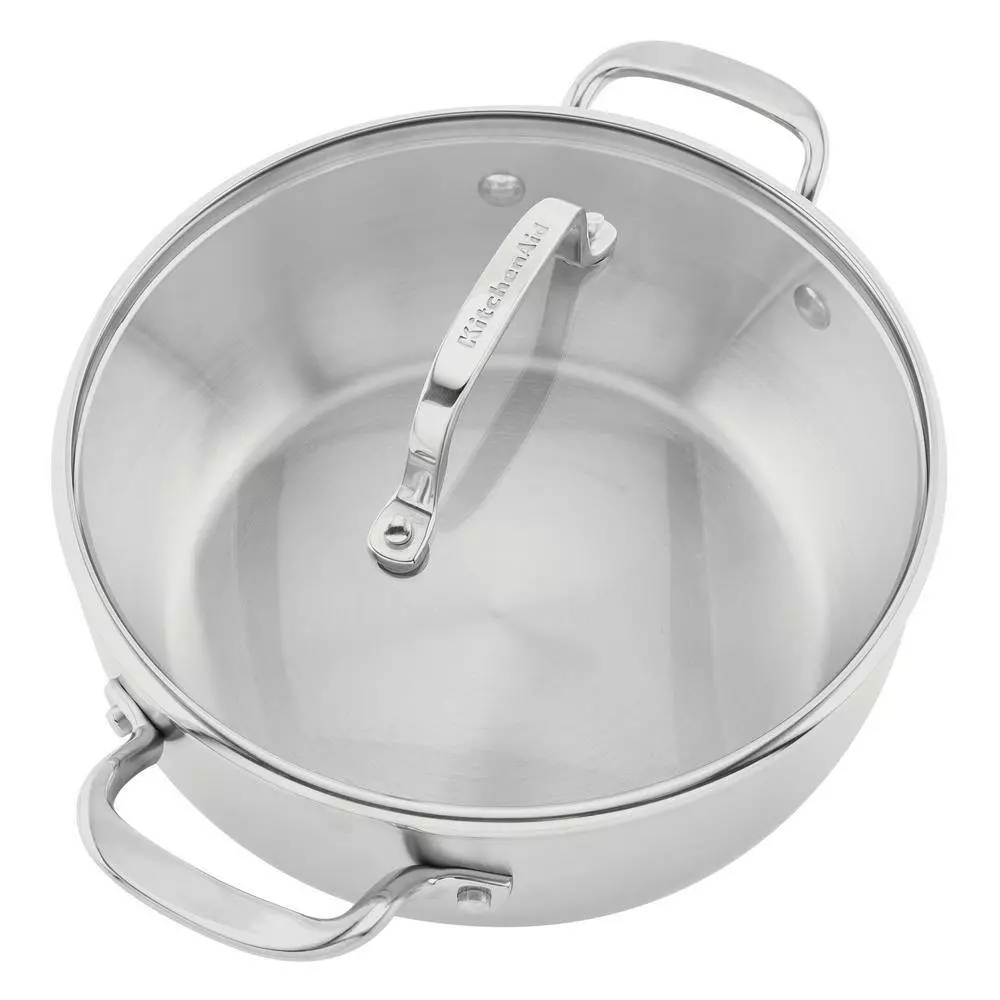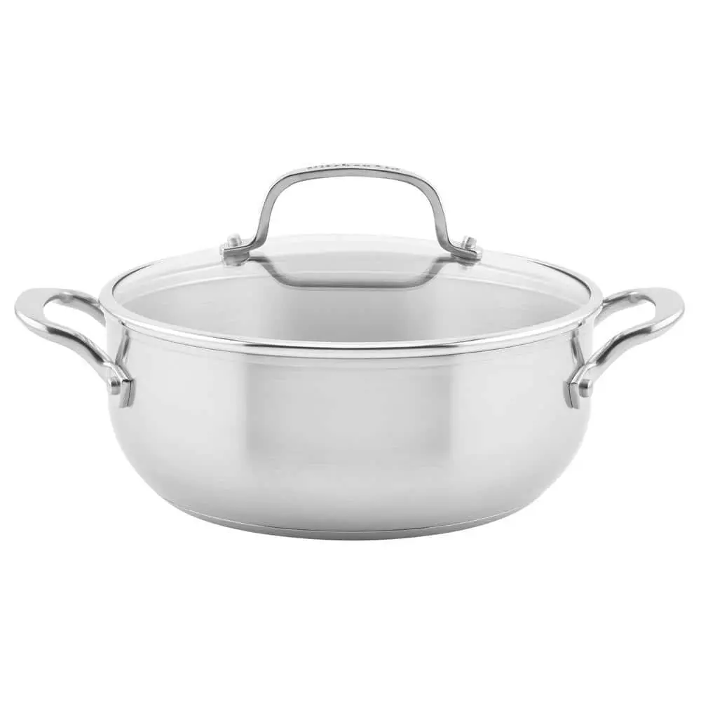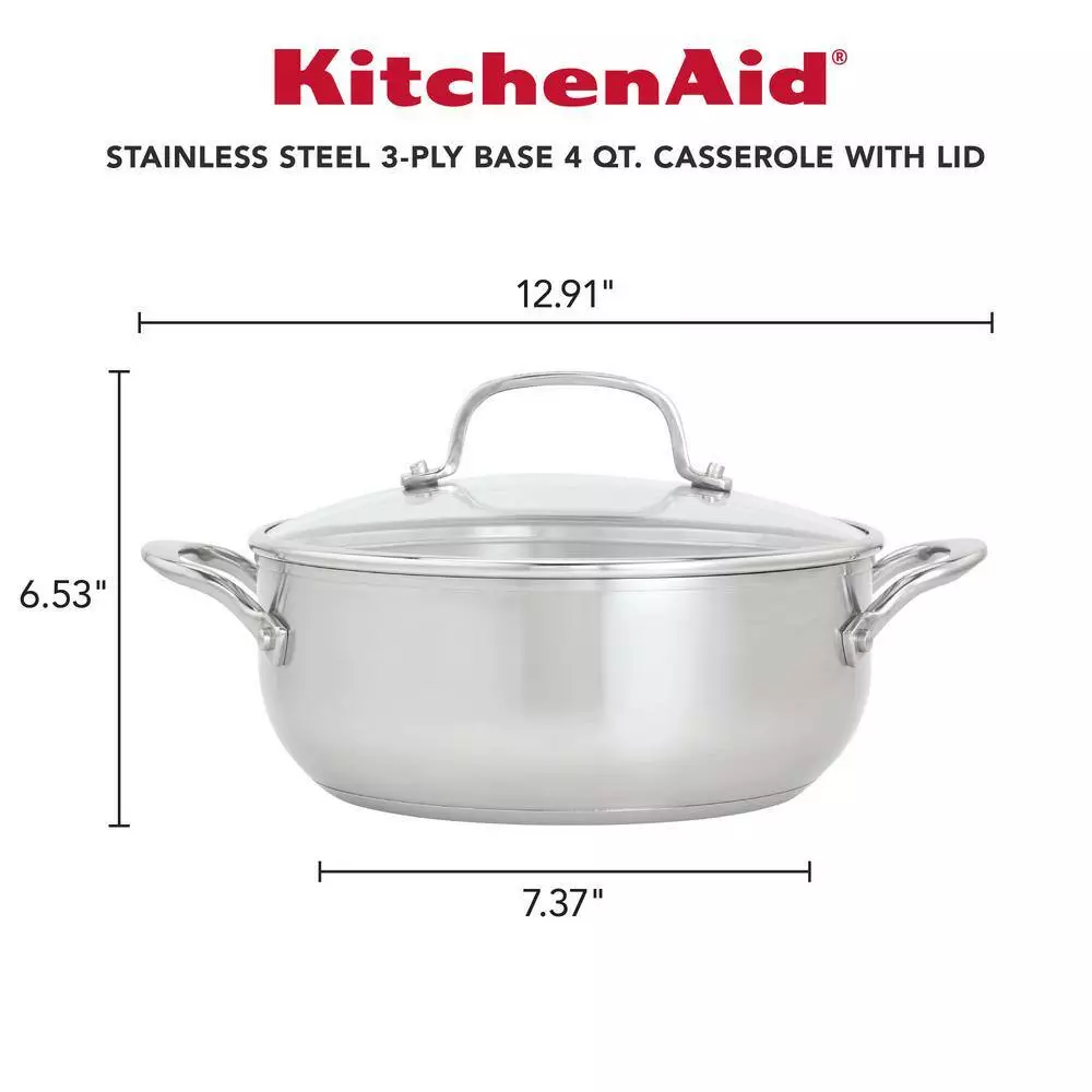 Experiment with and discover new flavors and techniques when cooking with the KitchenAid 3-Ply Base Stainless Steel Casserole, designed with an extra thick layer of heat-conducting aluminum to eliminate hot spots by distributing heat evenly from edge to edge. Heavy-gauge stainless steel pot features a heavy bottom base for lasting durability and has dual-riveted handles for a firm, confident grip when moving around the kitchen. Tempered glass lid helps to lock in heat for rich and textured flavor. Curious cooks can investigate a wider range of recipes in the broiler and oven, where cookware is safe to 500°F, 350°F with lid.