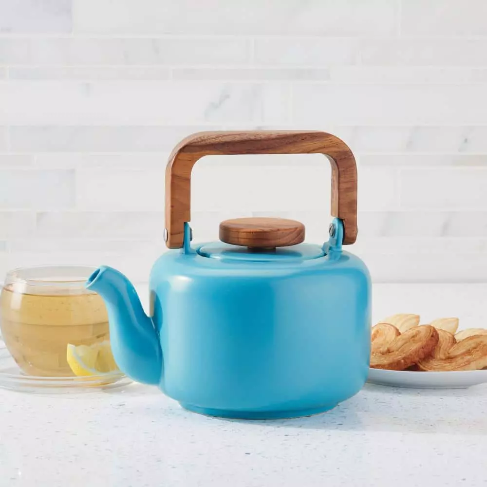 Enjoy a distinctive and creative tea and brewing experience with the BonJour Ceramic Coffee and Tea 4-Cup Ceramic Teapot with Infuser. Constructed from sturdy ceramic for stylish and dependable counter-to-table steeping, this elegant teapot gets a creative spin with a modern design and a fine, stain-resistant glazed finish. The durable stainless steel infuser attaches conveniently to a snug fitting lid topped with a knob of teak wood, prized for its natural beauty and durability, and a large teak wood handle makes it easy to pour cups of Earl Grey or a lemongrass and lavender herbal tea to pair with toast and marmalade or afternoon cucumber sandwiches. Plus, with an 4-cup capacity, this ceramic eye-catcher holds enough tea to pair with a full breakfast for four on the patio or host an afternoon gathering of friends. Pair the teapot with the BonJour Ceramic Sugar and Creamer set and you’ll be ready at a moment’s notice for a refreshing moment of deliciousness and relaxation. Pour another cup of stylish perfection and enjoy the elegant teatime experience of the BonJour Ceramic Coffee and Tea 4-Cup Ceramic Teapot with Infuser.