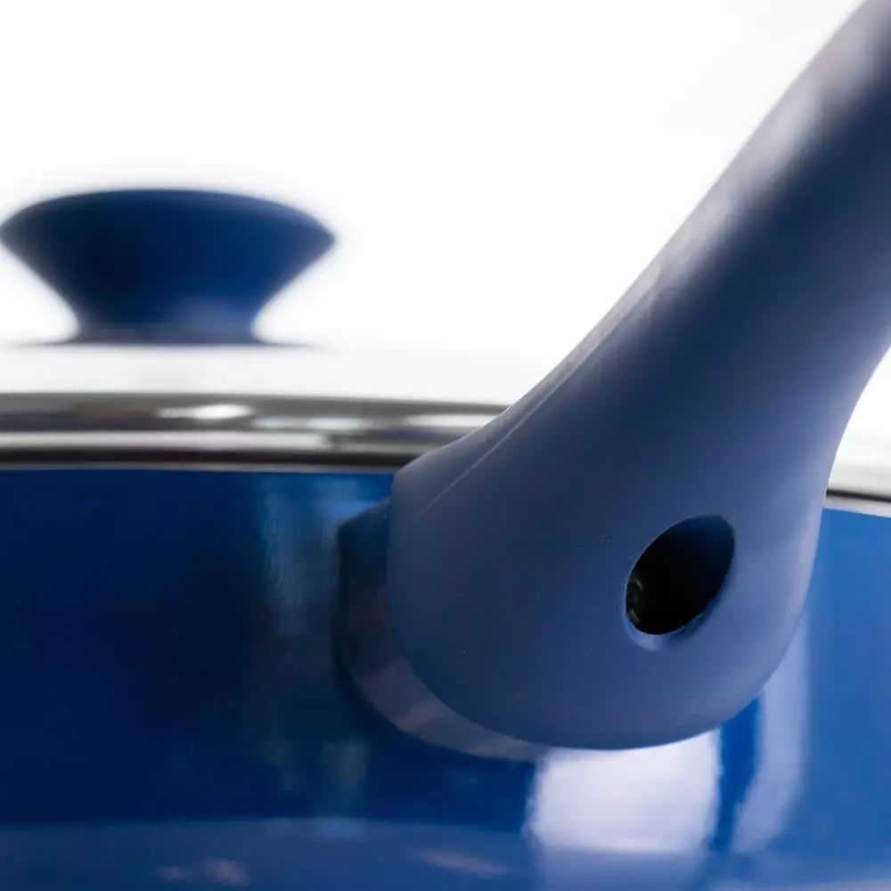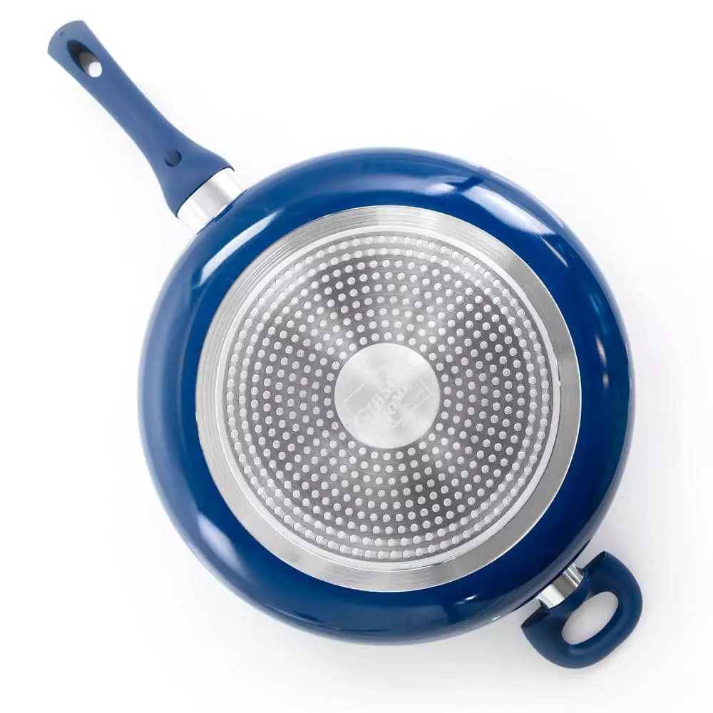 Cook delicious meals with the Gibson Home Charmont 5 qt. Nonstick Aluminum Saute Pan with Lid in Yale Blue. This saute pan is crafted from quality heavy gauge aluminum for long lasting durability and strength. This cookware also comes with a vented tempered glass lid, allowing you to easily monitor the cooking process. Feel free to cook with this saute pan on a wide range of heat options from; gas, electric, vitroceramic, halogen, and induction. This saute pan is also hand wash recommended in order to maintain its quality and extend its lifetime in your kitchen.