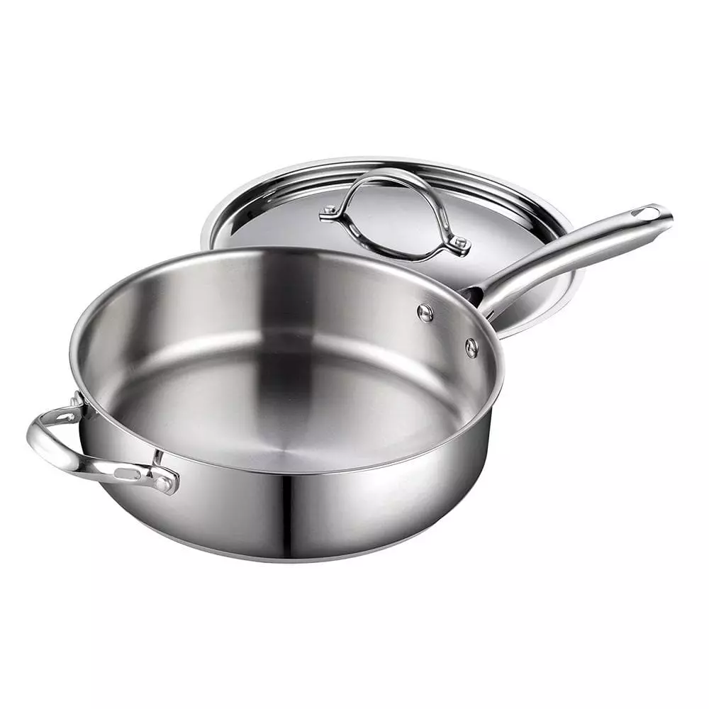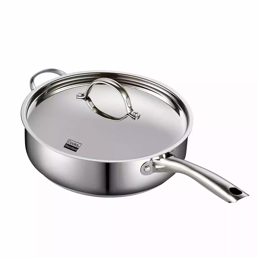 The Cooks Standard 5 Qt. Stainless Steel Saute Pan with Lid is made with stainless steel with an aluminum disc layered in the bottom. The aluminum disc provides even heat distribution and prevents hot spots. Stainless steel lid keeps in heat and moisture, oven safe to 500°F. Handles are attached to the cookware with 2 rivets that offers durability. Cookware is suitable with gas, electric, ceramic, glass and induction stoves. Dishwasher safe.
