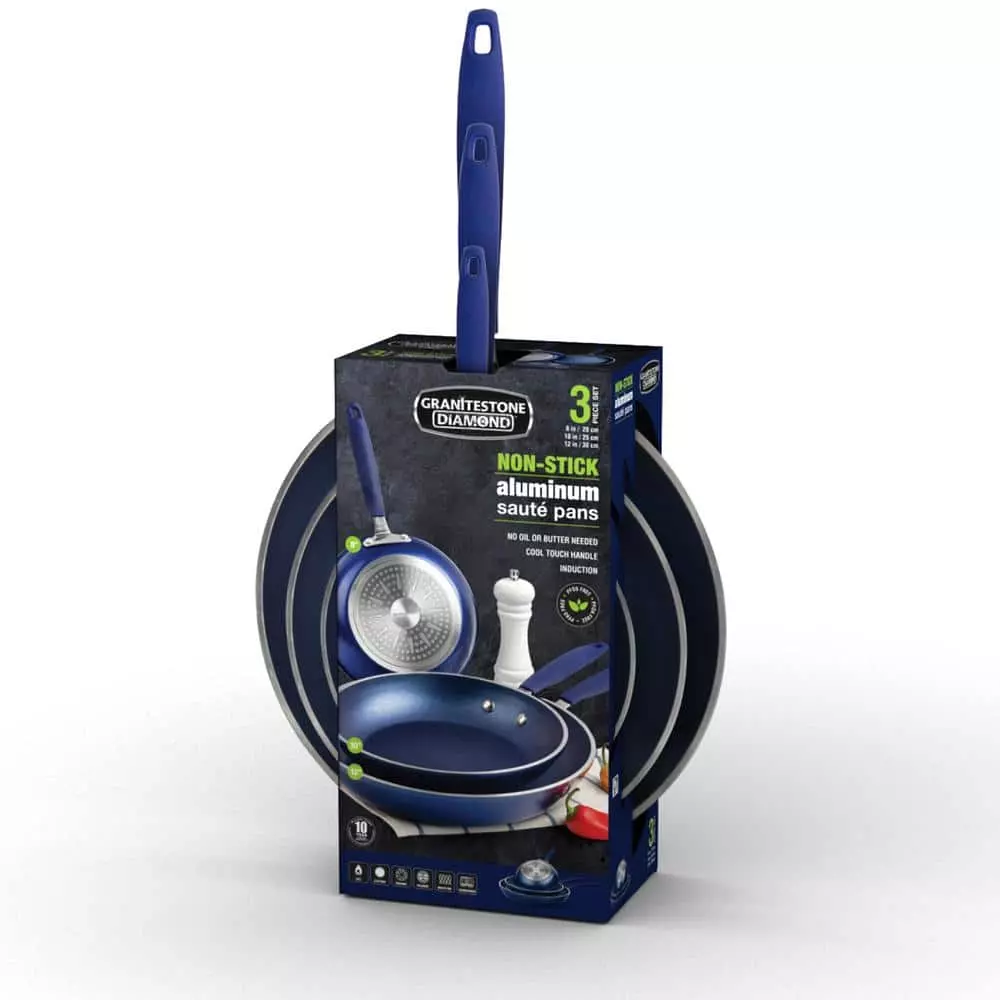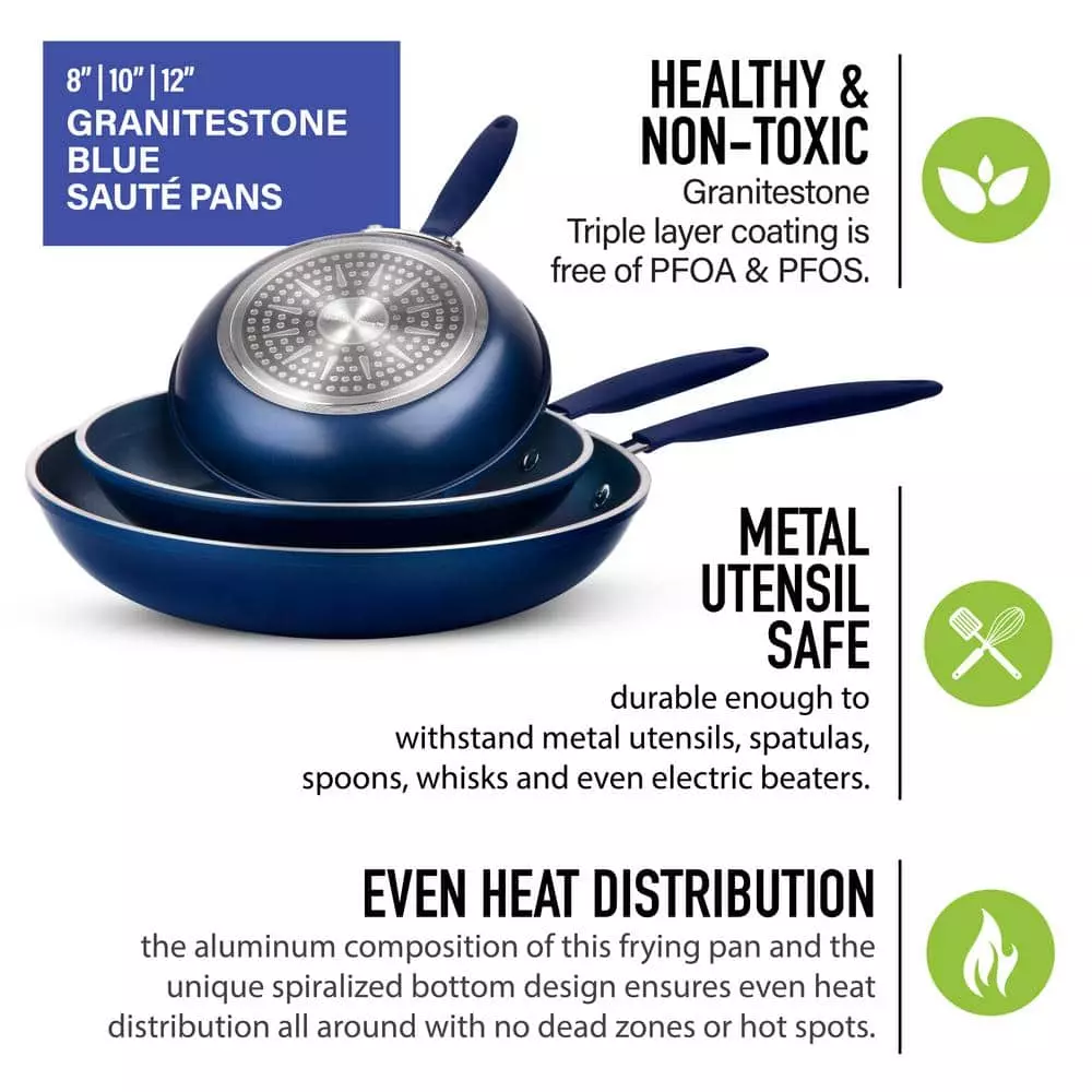 Granitestone Blue 3-Piece Nonstick Frying Pan Set, 8, 10, 12 Nonstick Mineral and Diamond Triple Coated Frying Pans, Nonstick Skillet Set. The GraniteStone cookware is PFOA Free, Dishwasher Safe and Metal Utensils Safe. This 3-PIECE NONSTICK FRYING PANS SET – this set includes an 8, 10 and 12 frying pan, which are perfect for nearly every kitchen task. the 10 Perfect for sunny side ups, sauteing vegetables, steaming broccoli, whipping up pancakes, scrambled eggs and omelets, searing steaks, grilling burgers and so much more.