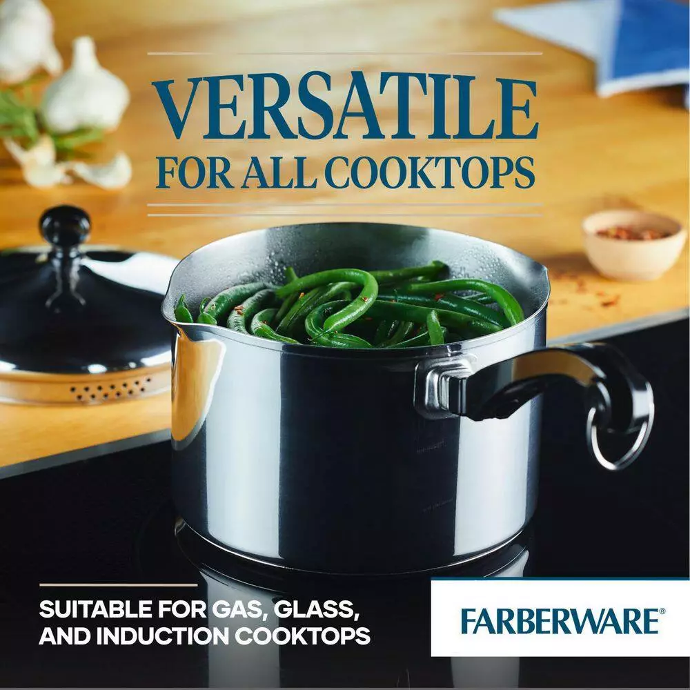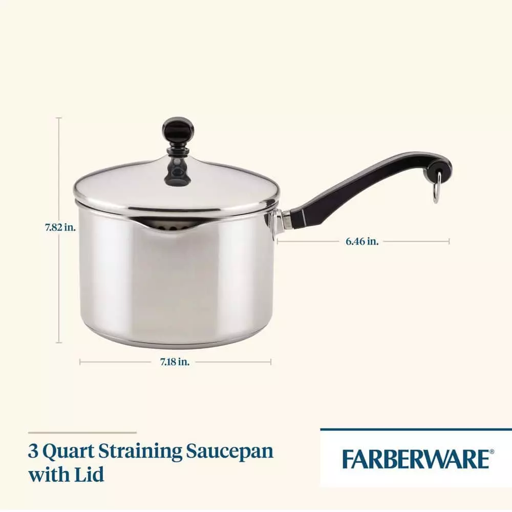 This versatile Farberware Classic Series Stainless Steel Straining Saucepan with Pour Spouts is super-versatile and eliminates the need for a seperate strainer or colander. Farberware has been trusted for over 100 years, and this straining saucepan continues that tradition for a new generation. A full cap base featuring a thick aluminum core surrounded by stainless steel provides rapid, even heating, whether boiling carrots or whisking a holiday gravy. Heavy-duty stainless steel is polished to a mirror finish for a classic touch. For covered cooking, rotate the self-basting lid to close the holes so heat and moisture stay inside the pan. To strain, simply align the lid’s holes with the pan’s pour spouts. The comfortable handle with iconic styling provides a confident grasp, making it easy to pour hot vegetable stock into a bowl or strain water from boiled potatoes. This straining saucepan is dishwasher safe and oven safe to 350°F, and it makes an excellent gift or companion piece to any Farberware collections cookware set. Find modern convenience and timeless style in this Farberware Classic Series Stainless Steel Straining Saucepan with Pour Spouts.