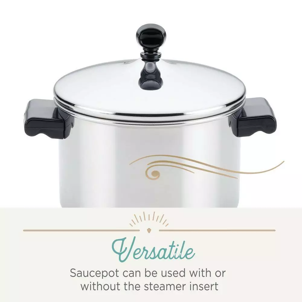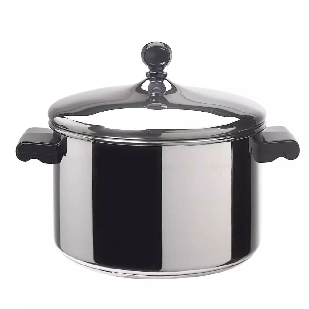 Making family-sized side dishes is a breeze with this Farberware Classic Series Stainless Steel 4-Quart Saucepot with Lid. Farberware has been trusted for over 100 years, and this saucepot continues that tradition for a new generation. A full cap base featuring a thick aluminum core surrounded by stainless steel provides rapid, even heating. Boil a batch of russet potatoes and mash the spuds right in the pot. The saucepot also works great for cooking artichokes, cauliflower and other vegetables. Heavy-duty stainless steel is polished to a mirror finish for a classic touch, and the ample, comfortable saucepot handles with iconic styling provides a confident grasp. A self-basting lid helps seal in heat and moisture, ideal for simmering a big batch of Spanish rice. This saucepot also is dishwasher safe and oven safe to 350°F. This convenient saucepot will make any Farberware cookware set even more versatile. Enjoy durability, performance and easy cleanup with this Farberware Classic Series Stainless Steel 4-Quart Saucepot with Lid.
