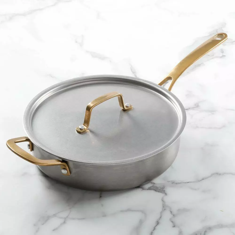 Step up your cooking skills with the Martha Stewart Everyday 3.5 Quart Tri Ply Stainless Steel Sauté Pan. The stainless-steel body brings a new array of recipes with with its stove top and oven safe feature. Each handle is embellished with a dazzling brass finished to accent the stainless-steel silver color. Hand wash after use to better preserve the stainless-steel finish. Reverse sear steaks, sauté and bake creamy gnocchi, or make the perfect stew.