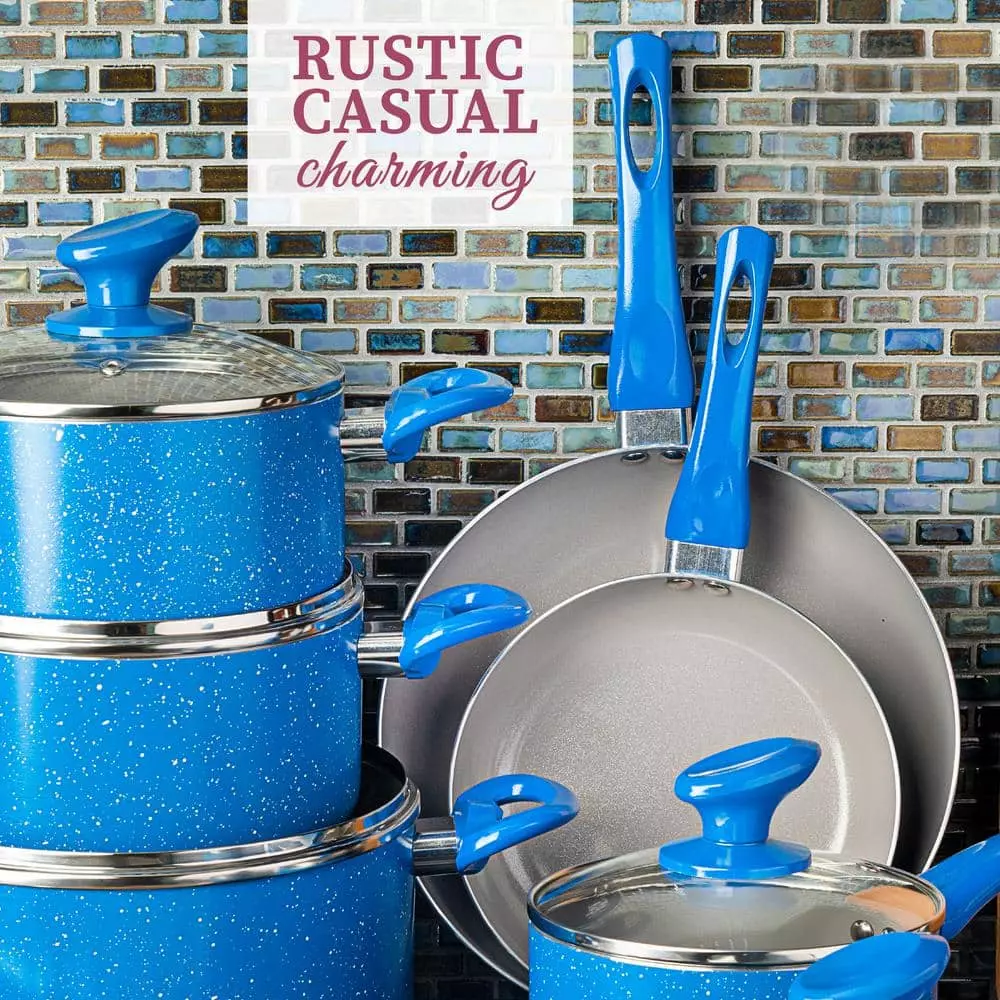 Upgrade your cookware collection with the modern performance of the Granite Stone Diamond Farmhouse Collection 13-Piece set. The Farmhouse Collection cookware features an unique and durable ceramic nonstick coating for effortless food release and cleanup. The pots and pans offer amazing heat distribution without dead zones or hot spots.