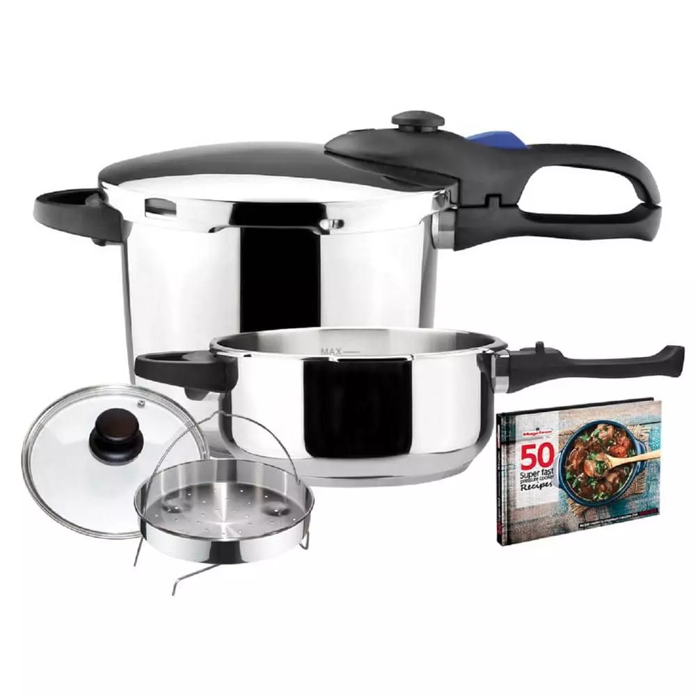 - Includes 6-pieces: 6.3 Qt. body, 4.2 Qt. body, pressure lid that fits both bodies, glass lid, steamer and hard cover recipe book (containing 50-delicious pressure cooker recipes, valued at $20.00)