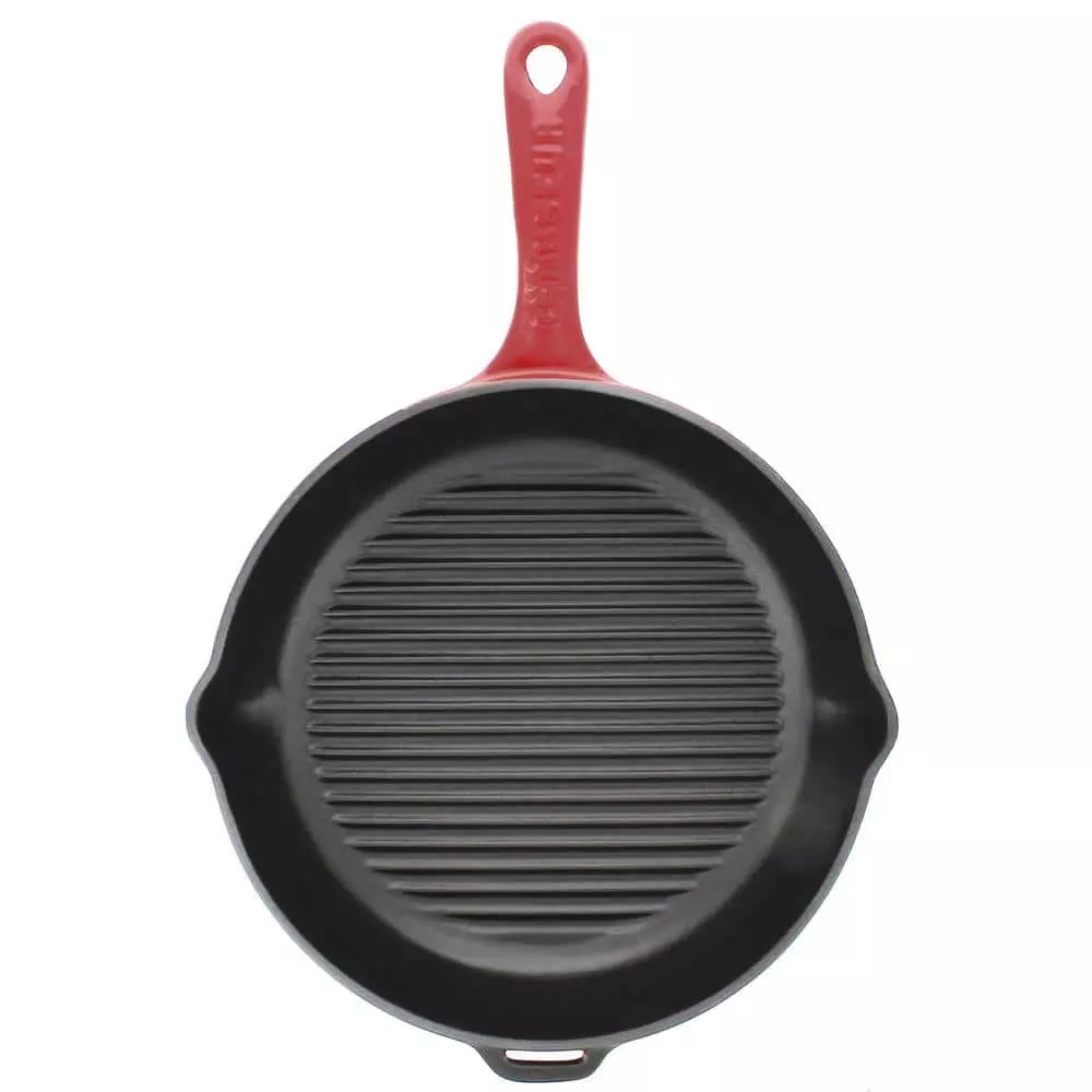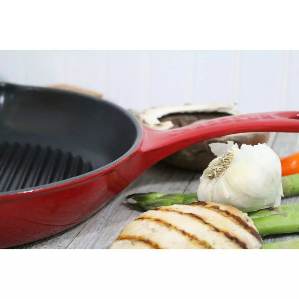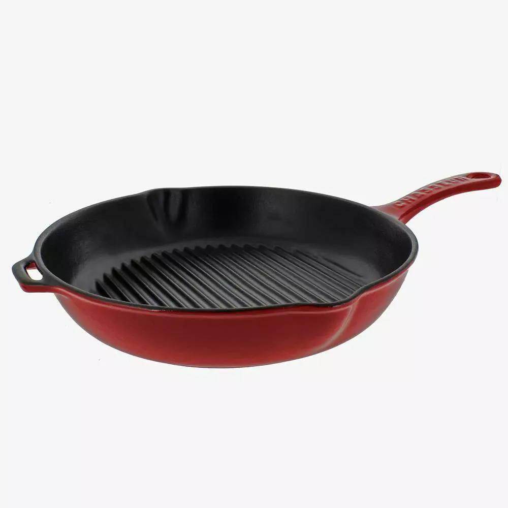 The Chasseur Round Cast Iron Grill provides all the flavor of an outdoor grill, with all the convenience of indoor cooking. This grill pan is constructed of thick cast iron to maintain its temperatureduring cooking, making it ideal for grilling anytime. While cooking, ridges allow excess fat and grease to drain, and the spouts on the edge allow for easy removal. The extra handles makes this fry pan easy to move and perfect for any kitchen.