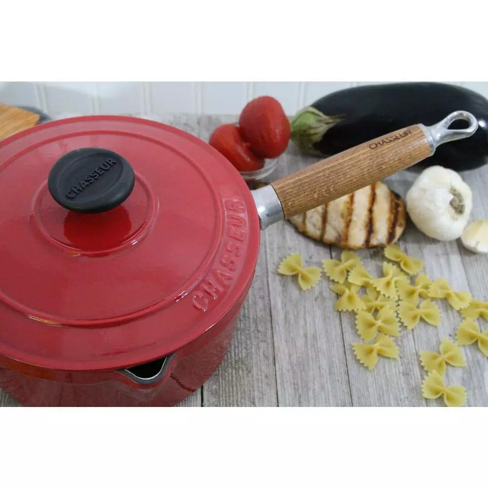Chasseur products, made in France, are sand-cast from solid iron and treated with multiple layers of non-reactive enamel to ensure durability and longevity. This sauce pan is compatible with nearly any cooking method, making it versatile and highly useful. The wooden handle provides a cool, sturdy grip, making it easy to go from cook top to oven. The spout on the edge allows for easy, drip free pouring.