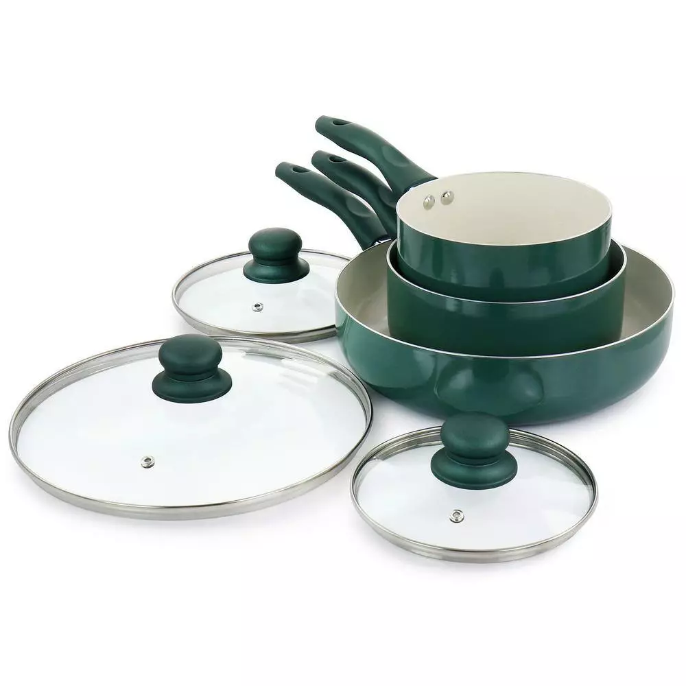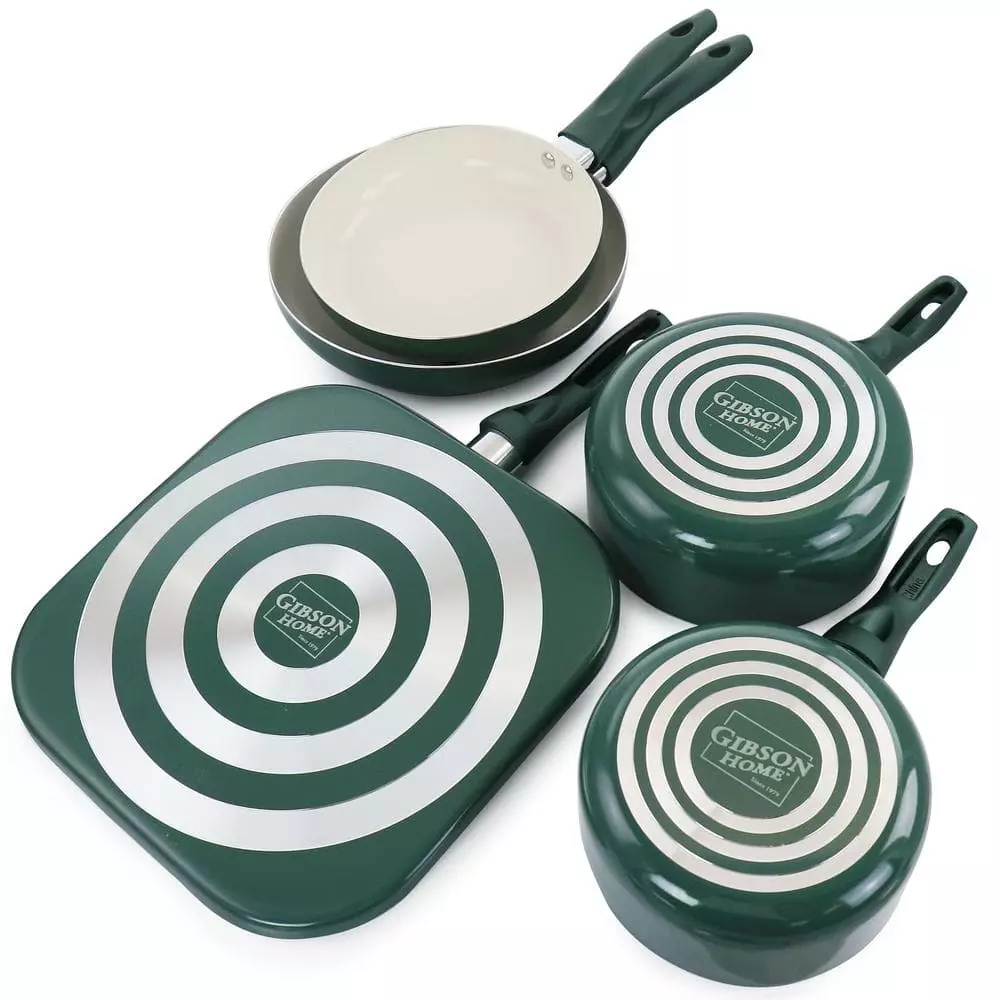 Get all your cooking essentials in 1 package with the 11-Piece Gazebo Cookware Set by Gibson Home. Each piece is constructed with durable aluminum that is coated with a ceramic nonstick coating that promotes healthy and Eco-friendly cooking. The nonstick coating prevents excessive stuck on food residue and allows for easy, hand wash recommended clean up. This set includes tempered glass lids for sauce and saute pans so you can monitor cooking progress safely. Soft grip Bakelite handles and knobs remain cool while you are cooking to provide a safe and worry free cooking experience. Pieces are compatible on gas, halogen, and electric cook tops.