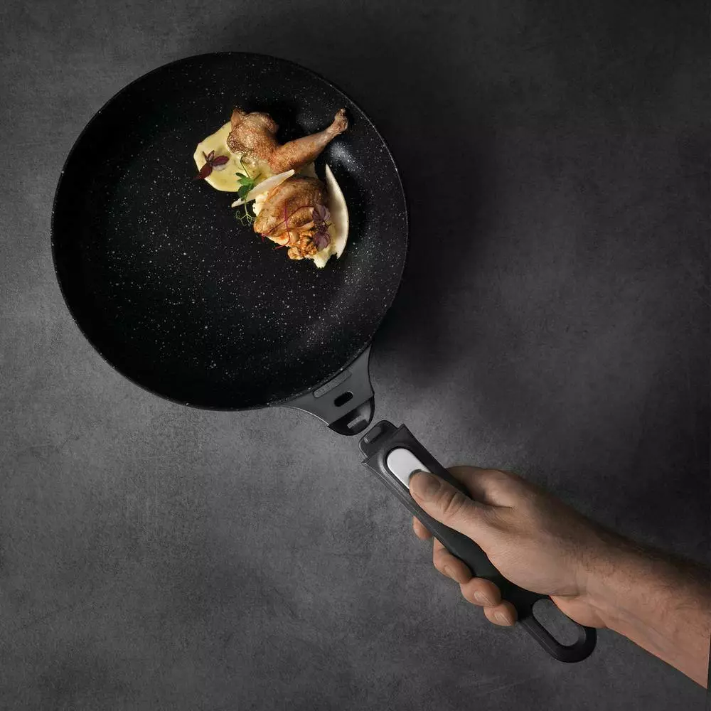 Highly functional with an innovative design, these frying pans are keepers. The variety of sizes allow you to make omelets or pancakes, pan-fry fish or sear meat before using it in a stew or casserole. The aluminum body ensures a fast and even heat distribution to avoid burned edges while the multi-layered non-stick coating makes no or low fat frying possible for health-conscious cooking. With a simple twist you can detach the handle to use these pans in the oven as well. Set includes: 8 in. Non-Stick Fry Pan, 10 in. Non-Stick Fry Pan, 11 in. Non-Stick Fry Pan.