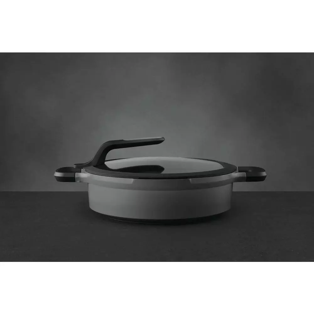 Got a frying, sauting or braising job to do? Then its time to get out this covered saut pan and work your magic on any kind of stovetop! Simply grab the stay-cool handles, add your ingredients to the aluminium body with high-quality non-stick coating and top the pan off with the matching lid that preserves the heat and moisture for energy-efficient cooking and an extra tasty result. When your food is ready you can either strain it with the different sized straining areas integrated in the lid or place the lid vertically on the pot so youve got your hands free to stir and serve. Suitable for all cooktops including induction. Inside dimensions: 11x11x3 / Outside dimensions: 16.25×11.5×5.5