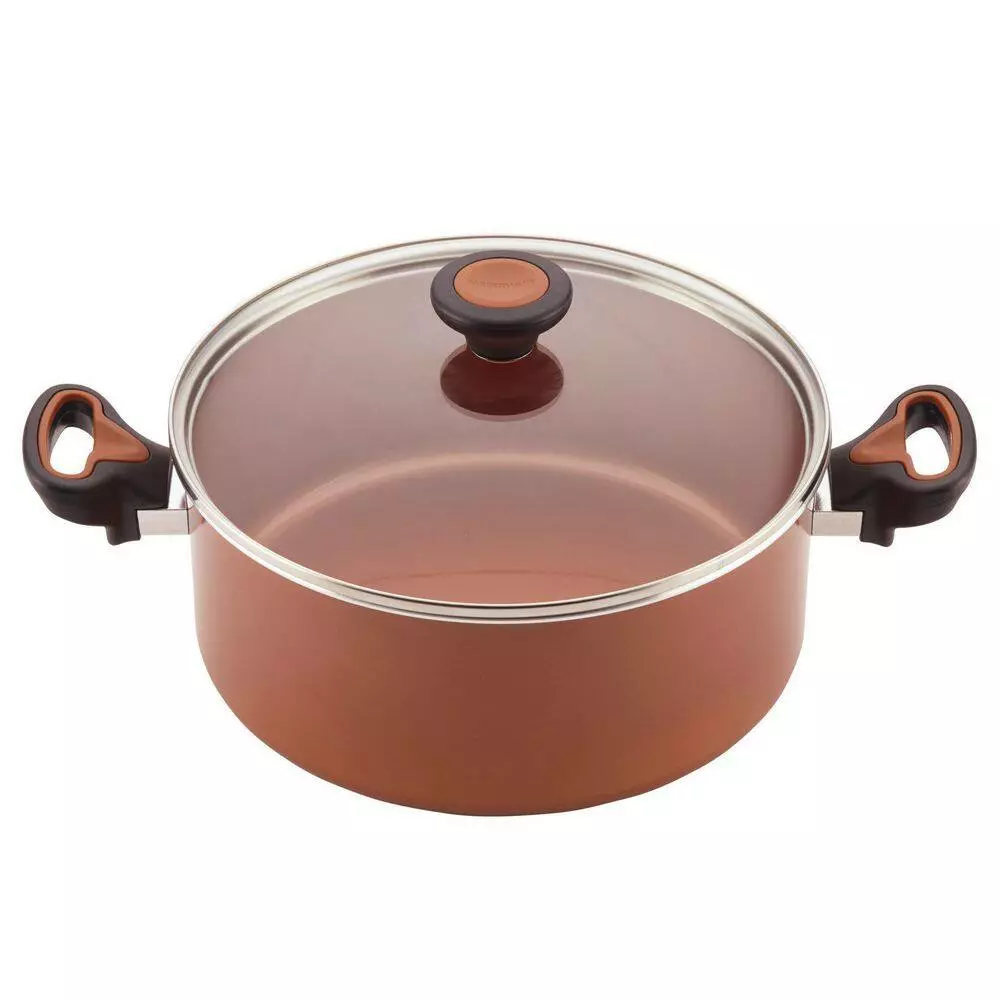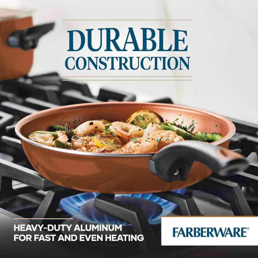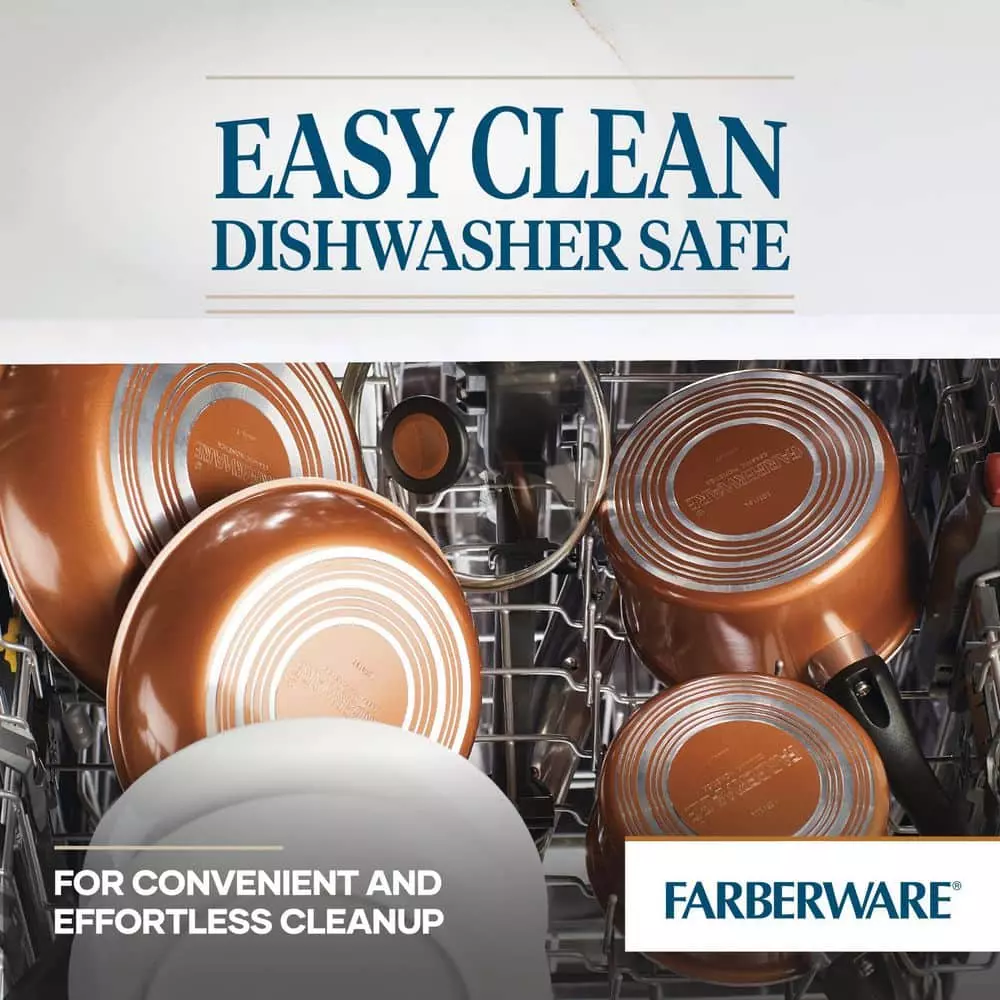 Cook up a weeknight batch of Easy Skillet Lasagna or a family-sized meal of One Pot Sausage and Mushroom Pasta with the superior ceramic nonstick features of the Farberware Glide Copper Ceramic Nonstick 12-Piece Cookware Set. This essential collection of saucepans, skillets and a Dutch oven are constructed from fast and even-heating aluminum, and boast CopperSlide technology for effortless nonstick food release and easy cleanup of even the stickiest recipes like seared flank steak fajitas or a weekend Denver omelet. The copper ceramic nonstick is dishwasher safe for easy cleaning, saucepans include snug-fitting glass lids to seal in heat and moisture, and the easy-hold handles provide a comfortable, confident grip to flip, fry, and saute; with ease. Oven safe to 350°F for stove to oven versatility, the pans are backed by Farberware’s hassle-free, no worries lifetime warranty. Plus, the set boasts three Prestige nylon tools including a slotted turner, slotted spoon and pasta fork so you can start cooking right out of the box. For great performance and long-lasting durability, reach for the Farberware Glide Copper Ceramic Nonstick 12-Piece Cookware Set.