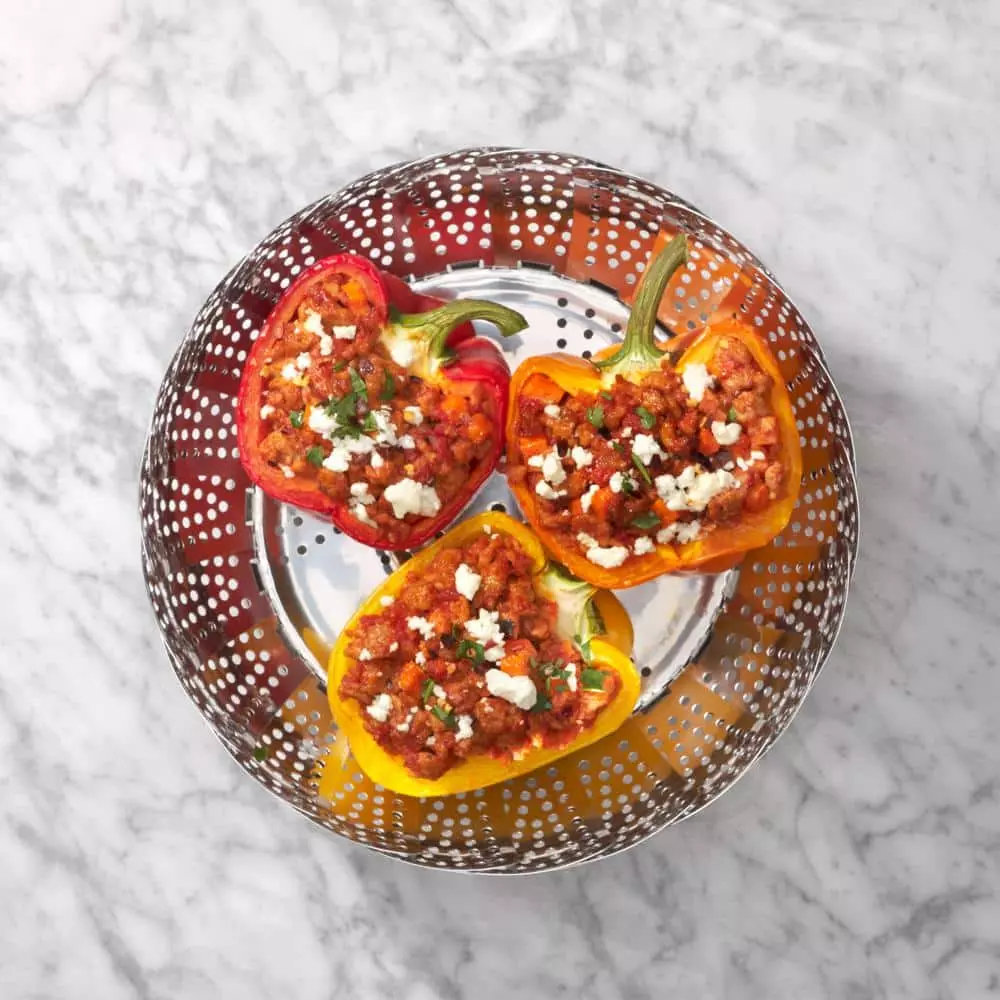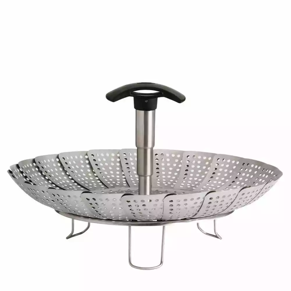 With a simple pull of the Stainless Steel Steamer’s telescoping handle, it extends to provide added length, making it easy and safe to use in hot pots. Press the handle again to lock it down and fold feet in for compact storage. For even more reach, a fork can be inserted into the handle. Steamer works well in most pressure and multi-cookers. No kitchen is complete without this vegetable steamer.