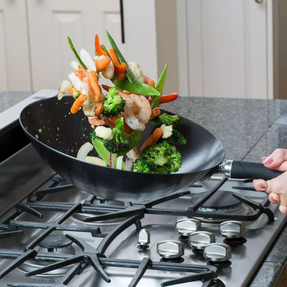 Made of carbon steel and nonstick interior coating this Wok is ideal for your cooking needs. It has a soft touch riveted handle making it easier to hold. Non stick is PFOA free so that it is better for the environment. Wok has a flat bottom for better balance and is suitable for all heat sources, including induction.