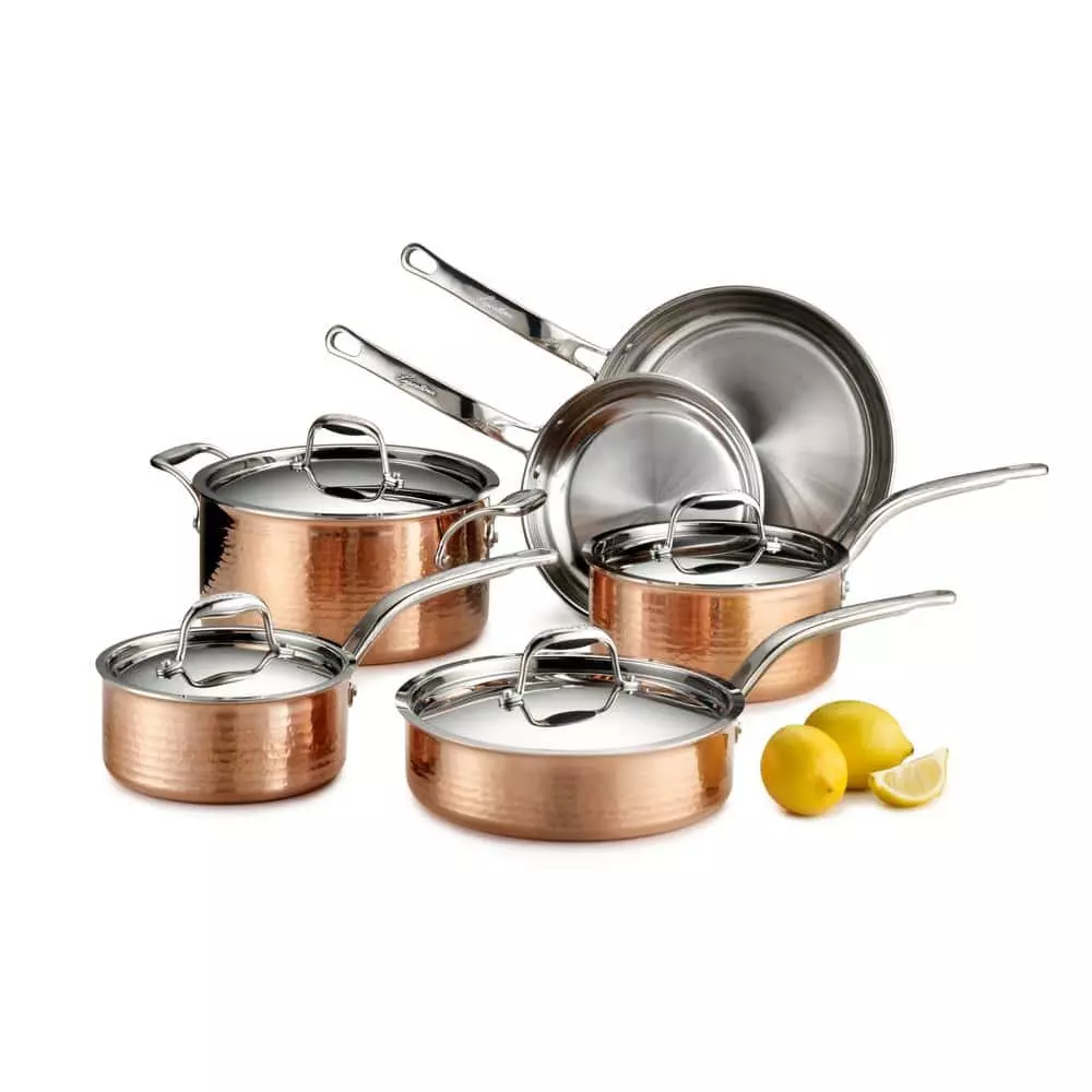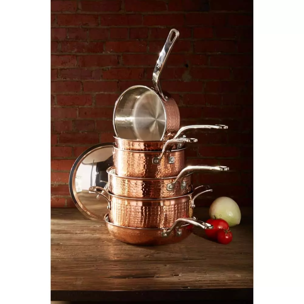 The Martellata copper 10 piece set is inspired by generations of passionate Italian cooking. With a beautiful hammered copper exterior and a stainless steel interior, pans look stunning in the kitchen and on the table. The tri-ply stainless construction provides even heat throughout the entire pan while the copper exterior heats and cools quickly, great for fast boiling or making delicate sauces. Topped with polished stainless steel lids and riveted handles, these pans look great and are built to last for a lifetime of memorable meals. Pans are oven and broiler safe for versatile cooking. The set includes all of the basic pans you need to cook a delicious meal for a crowd: 8 skillet, 10 skillet, 2 Qt. Saucepan with lid, 3 Qt. Saucepan with lid, 3 Qt. Deep saute with lid, 6 Qt. stockpot with lid.