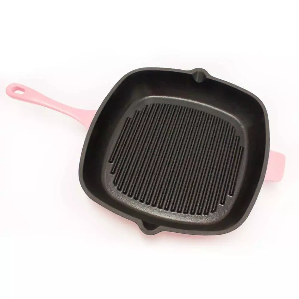 This Neo, cast iron, pink, 11 in. grill pan is a perfect tool for the serious chef looking to expand their collection. Built to last, self-seasoning, and boasting superior, even heating, one use and you’ll wonder why you used anything else. Features an attractive, enameled exterior. Usable with any heat source, including induction, and easily cleaned with soap and water. Oven safe up to 400F.