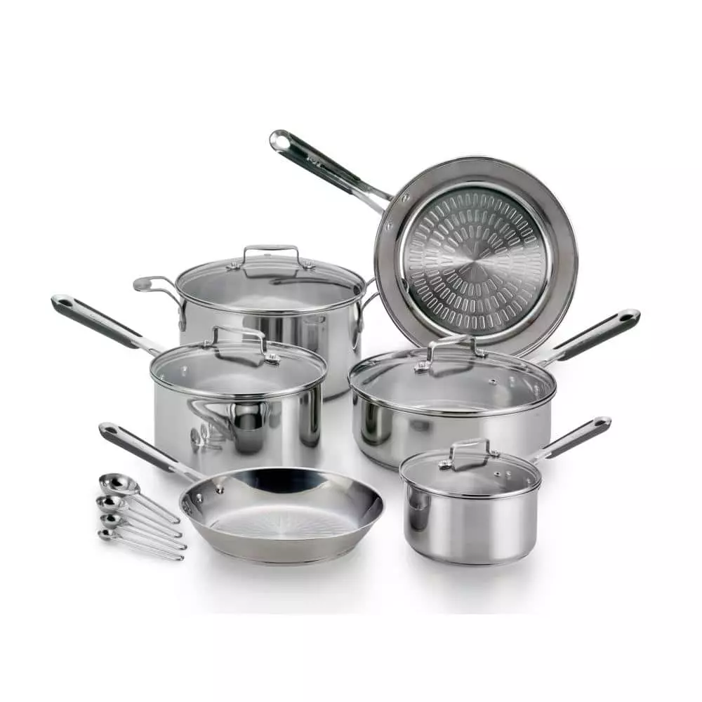 - Includes: 8 in. and 10.5 in. frypans, 1 Qt. cvd saucepan, 3 Qt. cvd saucepan, 3.5 Qt. deep saute pan, 5 Qt. cvd dutch oven and four stainless steel measuring spoons