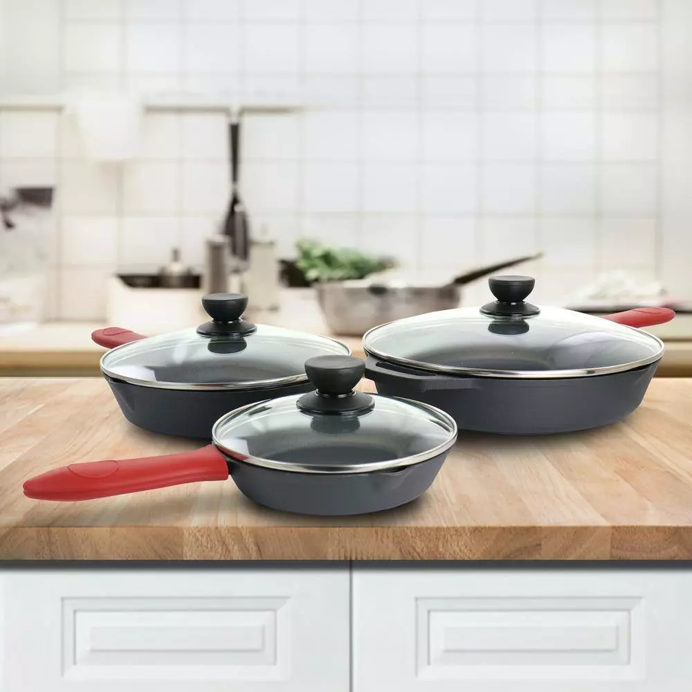 The MegaChef 9-Piece Cast Iron Skillet Set with Lids and Red Silicone Holder is perfect for sauteing, searing, pan-frying, baking, broiling and roasting all your favorite meals. With the lifelong durability and versatility, the cast iron skillets combine rich heritage with modern needs. Offering a healthier alternative to nonstick skillets, the cast iron distributes heat evenly for a more flavorful dining experience. This cookware also moves seamlessly from the refrigerator to the stove-top or oven to the table for easy serving.