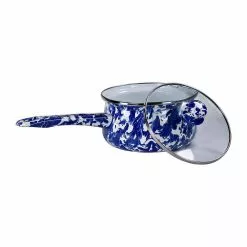 Cobalt Swirl 1.25 qt. Porcelain-Coated Steel Sauce Pan in Sea Glass with Glass Lid by Golden Rabbit