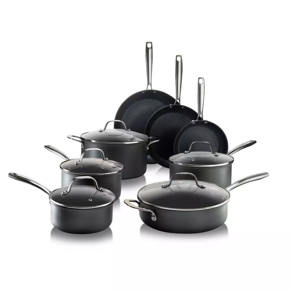 - Set includes – 8 in. skillet, 10 in. fry pan, 12. 5 in. fry pan, 1.5-qt. sauce pan with lid, 2.5 qt. sauce pan with lid, 3-qt. chef’s pan with lid, 3-qt. saute pan with lid, 6-quart stock pot with lid
