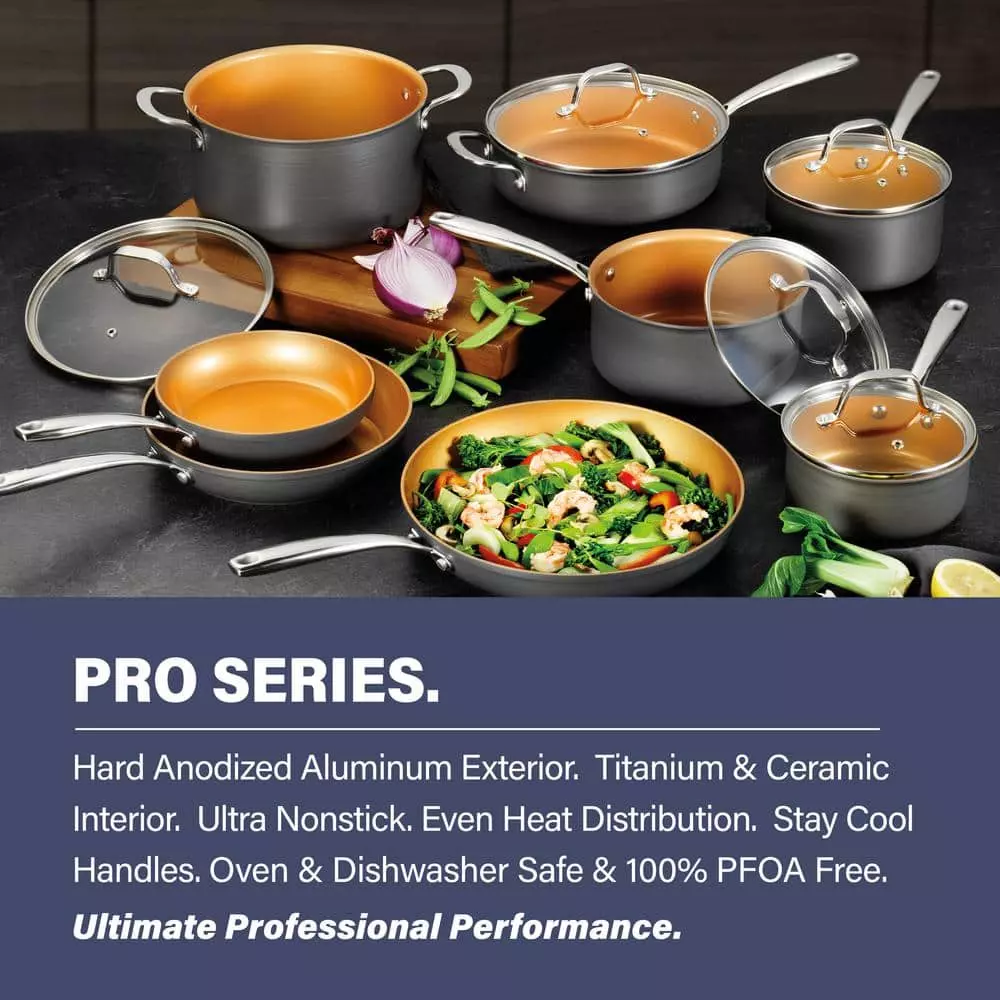 Gotham Steel Pro 13 Piece Hard Anodized Set, stronger than stainless steel cookware, hard-anodized aluminum exterior is dense, nonporous, and highly wear-resistant for the ultimate professional performance. The 2.8 MM thick Anodized base is built to withstand the toughest cooking scenarios. The base is designed to absorb high heat and retain and disperse it evenly across the entire pan. No hot spots, No warping. So you your food cooks better & your cookware lasts longer. A Superior Base, For a Superior Cooking Experience. Induction base can be used on both gas or electric cooktops.