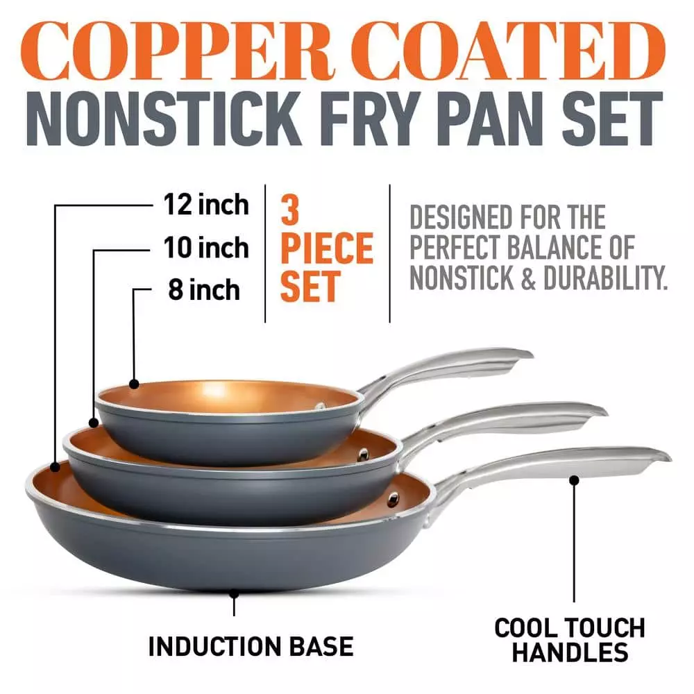 - 3-piece nonstick frying pans set – this set includes an 8 in., 10 in. and 12 in. frying pan, which are perfect for nearly every kitchen task. the 9.5 in. perfect for sunny side ups, sauteing vegetables, steaming broccoli, whipping up pancakes, scrambled eggs and omelets, searing steaks, grilling burgers and so much more