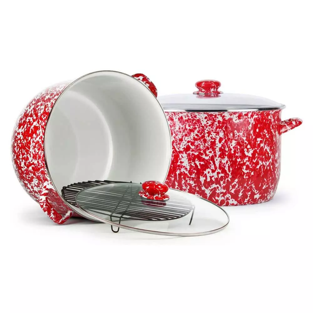 18 qt. Stock Pot with rack, 8 in. deep x 13 in. wide interior with glass lid This enamelware is made of carbon steel coated with a porcelain enamel and trimmed in stainless steel. There will be variations in the shading of colors and pattern formations which are the results of the hand-dipped process. The swirl design is a classic, retro staple for enamelware cookware and serveware. The contrast of colors creates a distinct look and brings a casual artistic flair to your table setting. Each piece is individually hand crafted and is as unique as you are. Skilled artisans hand dip the white background color, then use a brush to hand apply the secondary color swirls. This creates a unique piece and design each time. The elegant and inviting aesthetic draws the eyes into the many spattered patterns flowing throughout. Your piece will be one-of-a-kind and exclusive to you as you create your own distinctive style.