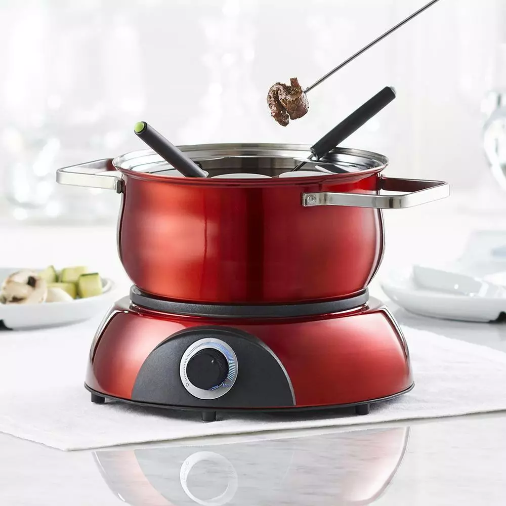 Keep the good times rolling with the Scarlet 3-in-1 Electric Fondue Set. Discover succulent fondue recipes and bring everyone together around for an evening of tasty treats. In the mood for savory meat, rich Swiss fondue, or decadent chocolate fondue. Simply adjust the thermostat and relax knowing you’ve got the perfect temperature setting for every course. Immerse your meat in the fondue pot or use the stoneware double-boiler for perfectly melted cheese or chocolate. Cleaning up is easy. Stainless steel color-tipped forks, a fork guide and a quick-release safety cord add to the long list of thoughtful features. There’s even a recipe booklet included. With a 84 oz. capacity, the Scarlet 3-in-1 Electric Fondue Set is made for delicious and fuss-free family time.